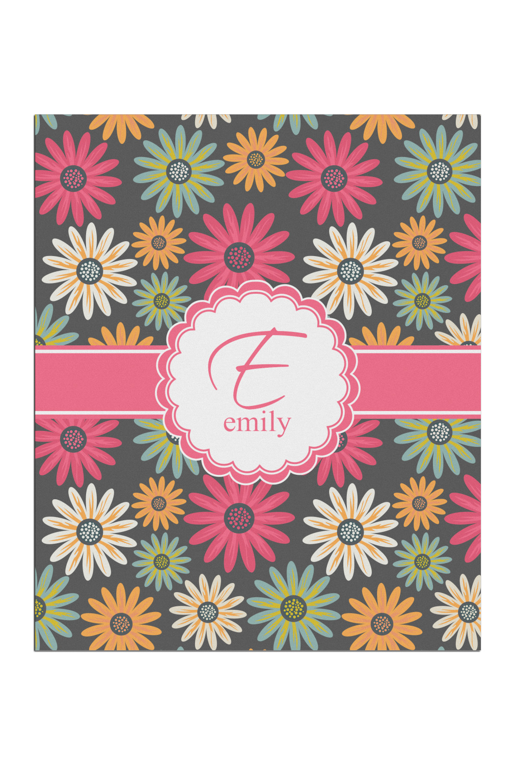 The flowers in this design are are a vibrant mix of fall colors, all on a deep gray background. The design has a classic ribbon in hot pink, the perfect place to add a name for that personal touch to pull the entire design together.