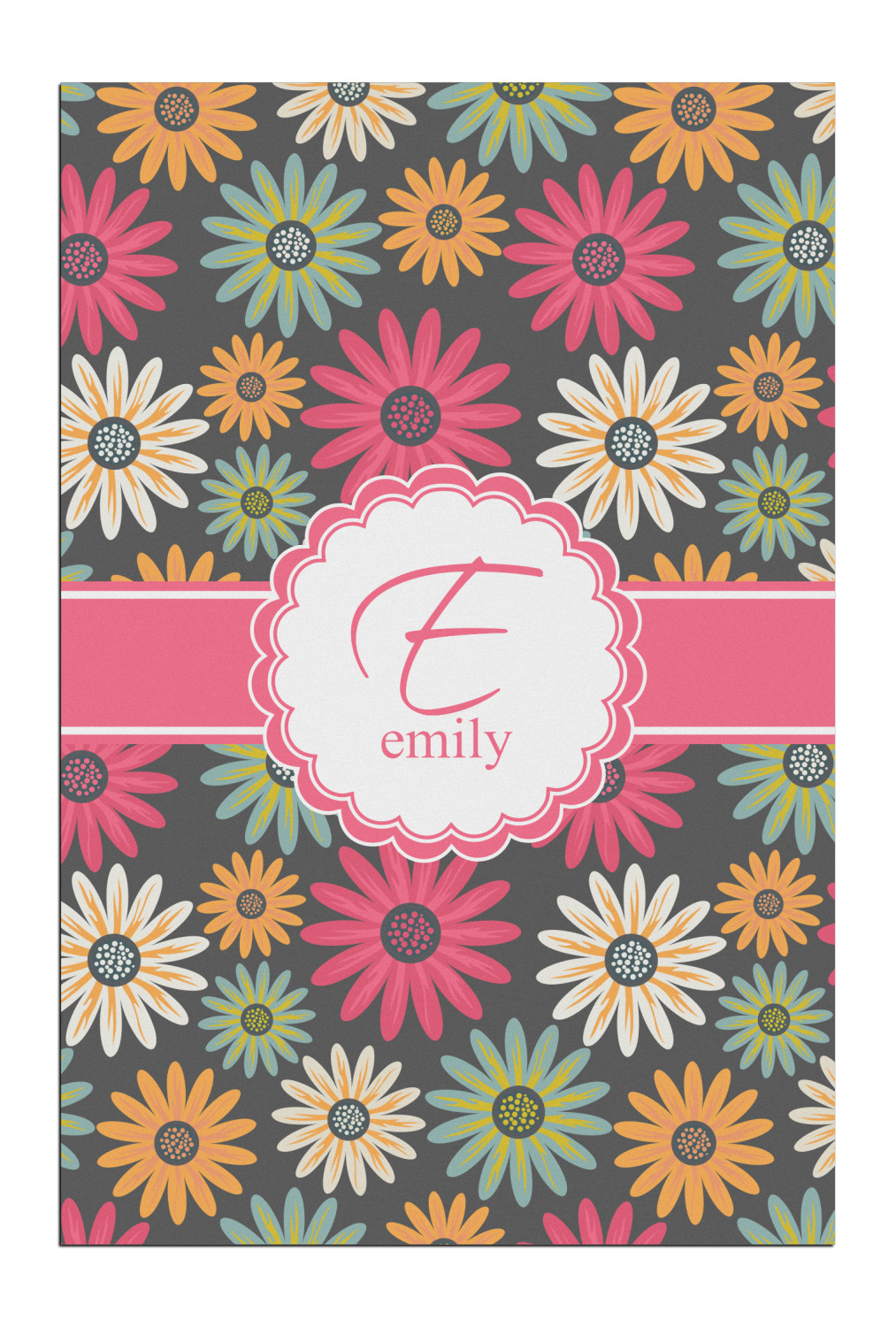 The flowers in this design are are a vibrant mix of fall colors, all on a deep gray background. The design has a classic ribbon in hot pink, the perfect place to add a name for that personal touch to pull the entire design together.