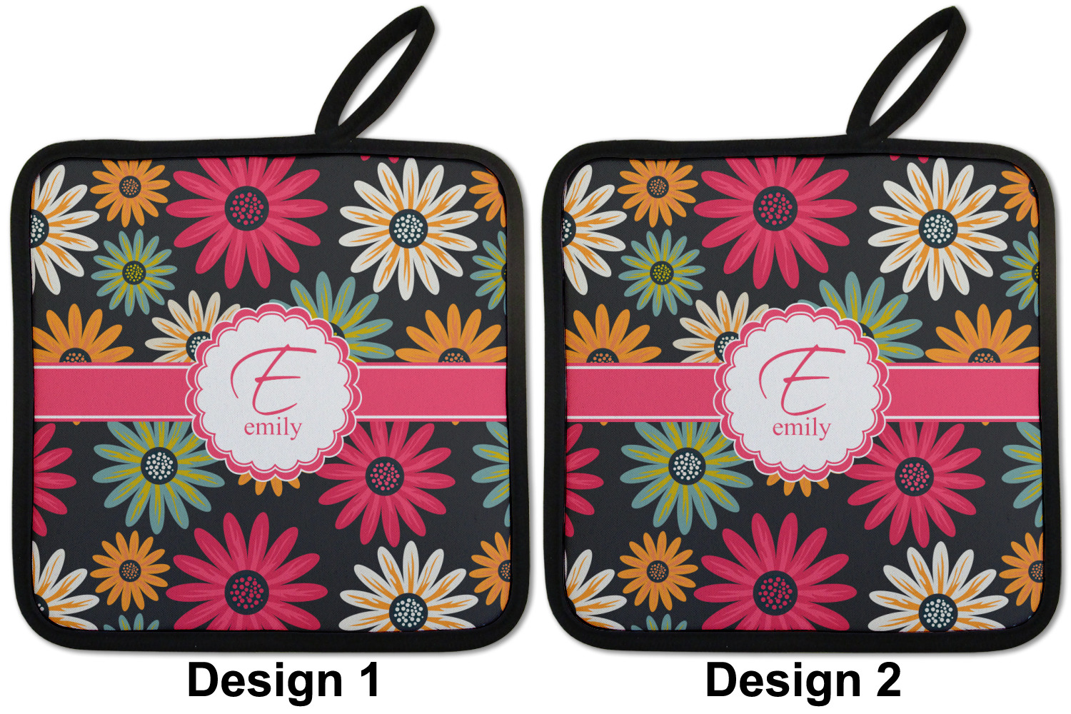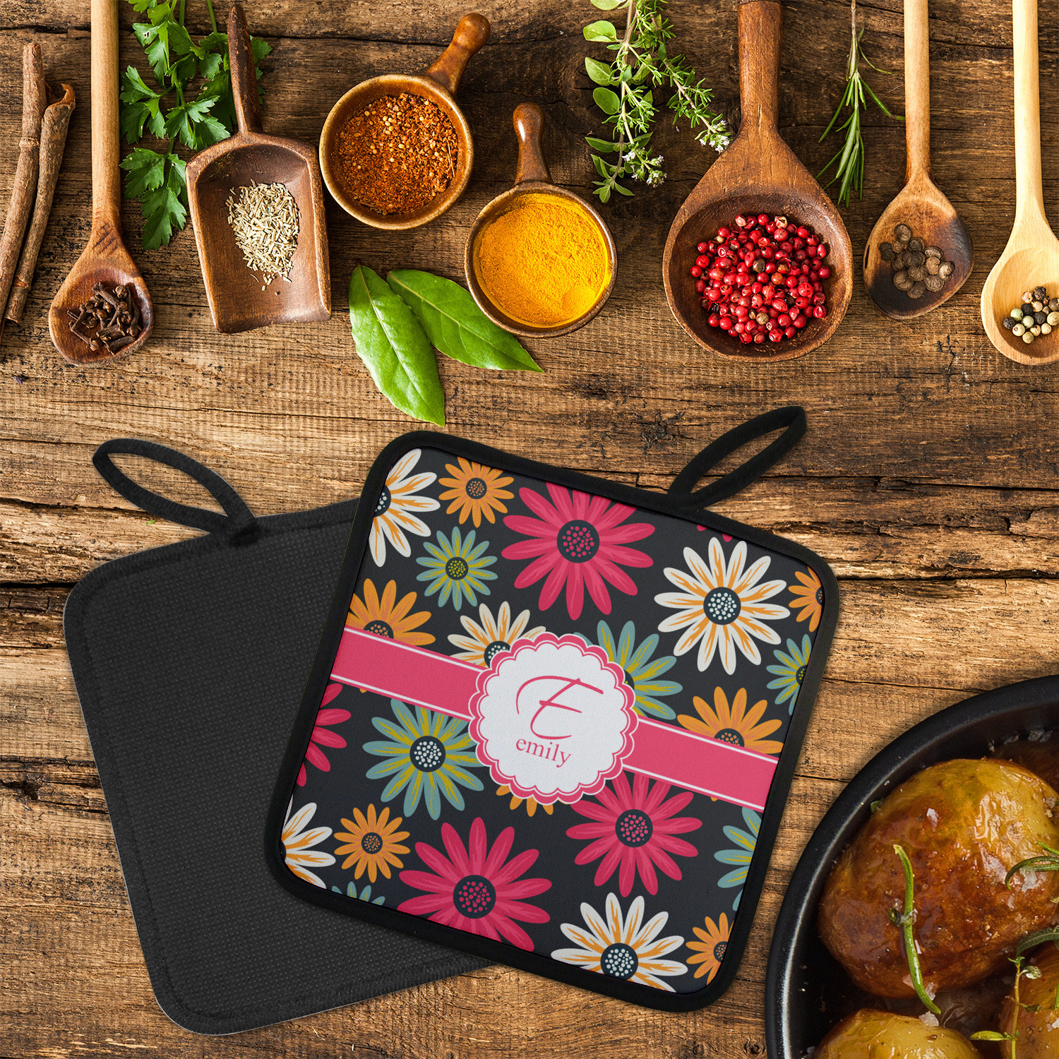 Our personalized pot holders feature a neoprene front that displays your personalization in vibrant colors. The backing of the hot pot holder is rubberized; the textured backing allows you to have a great grip when using this custom pot holder. The two materials are joined with a sleek, black trim, and the holder also includes an attached loop for hanging and storage. The pot holder is approximately 8.75 inches by 8.75 inches and 0.25 inches tall, while the fabric loop is 2.5 inches long. You can purchase a kitchen pot holder by itself or as a set of 2. We also offer a set including one pot holder and one oven mitt.