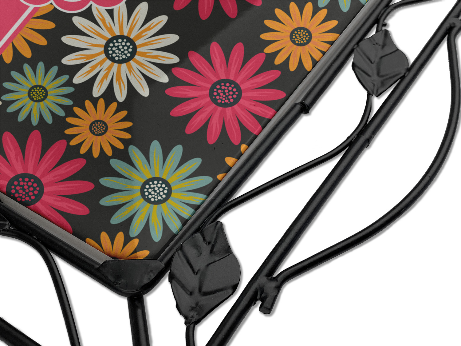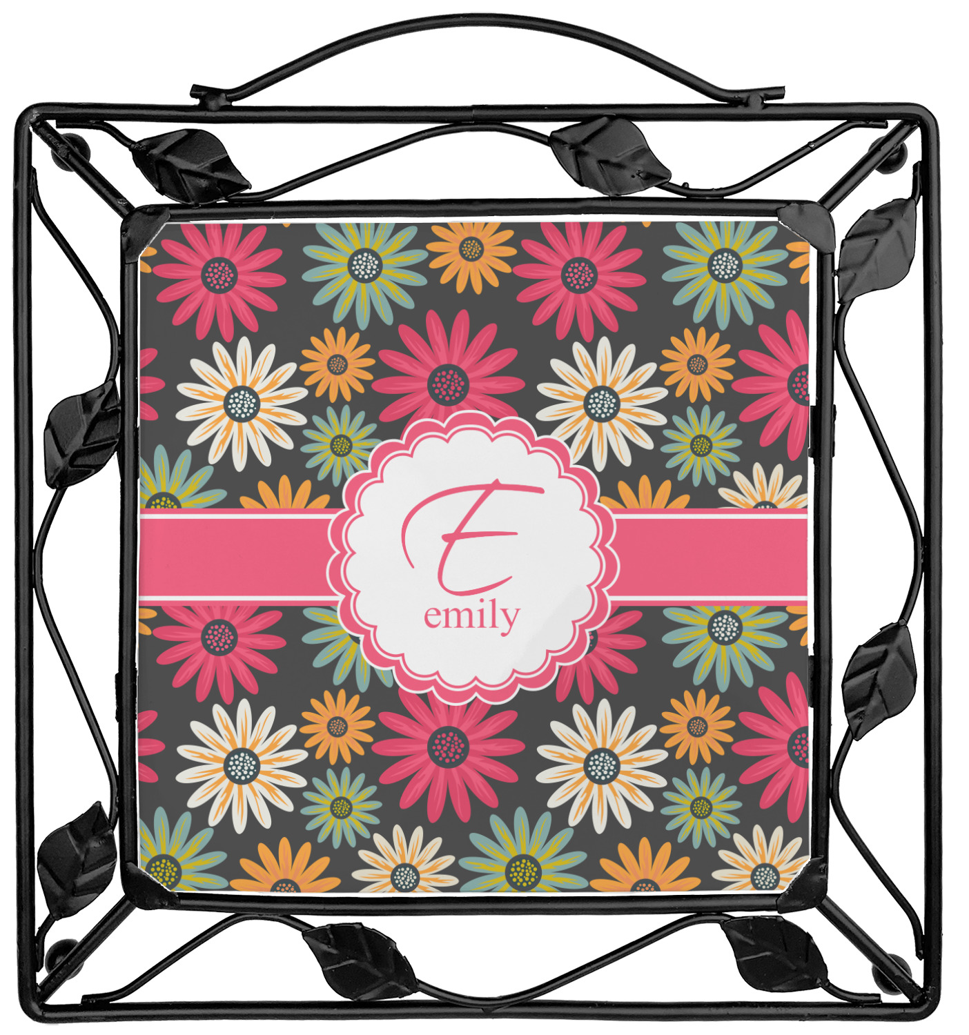 Our square trivets are made from a durable, wrought iron. This model features 4 small half circles, one on each corner, and a larger ring of iron that circles the central, customized tile. Each of the 4 corners has a round foot on its bottom for stability. This trivet is 8.75 by 8.75 inches, but the central tile measures at 6 inches on both sides.