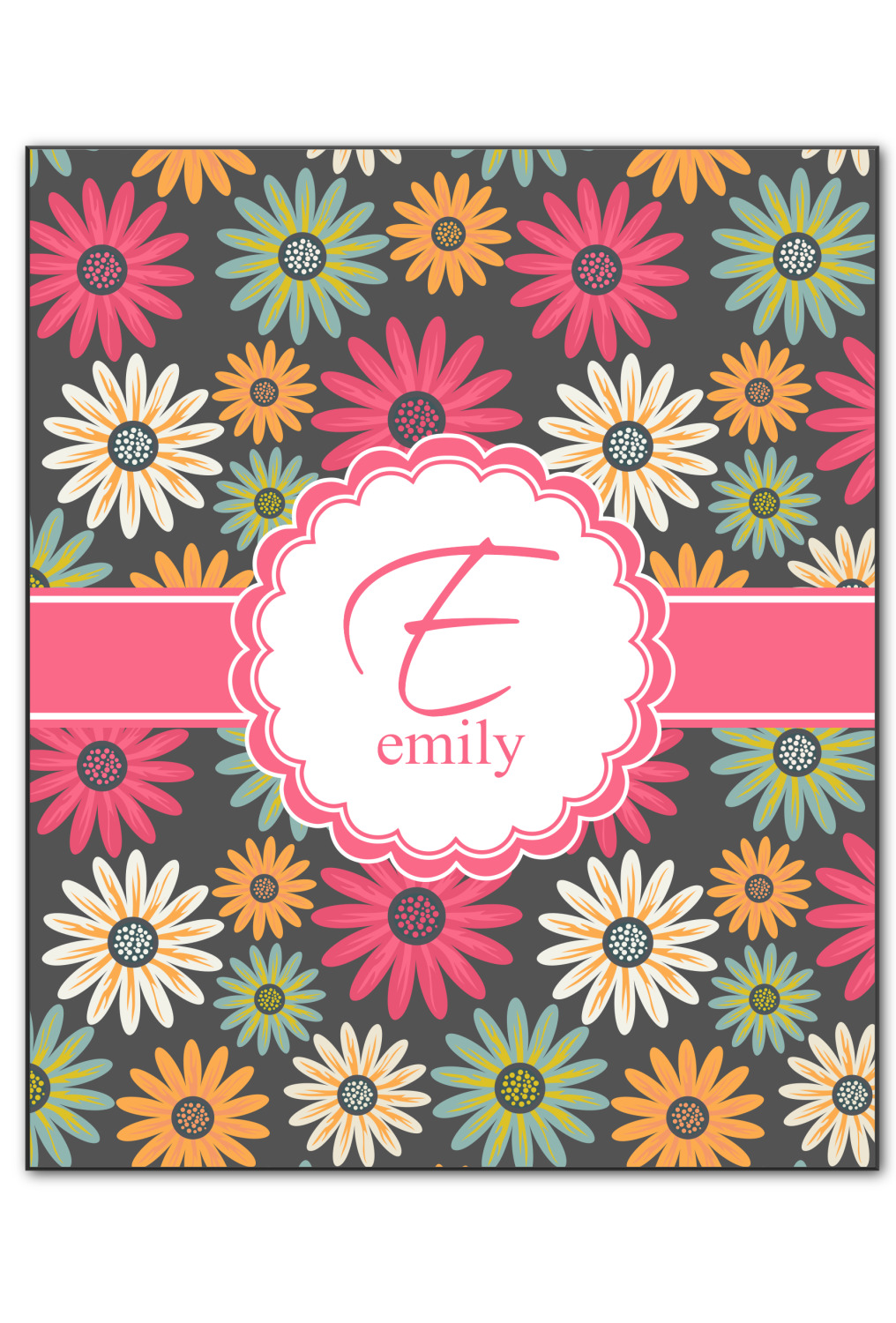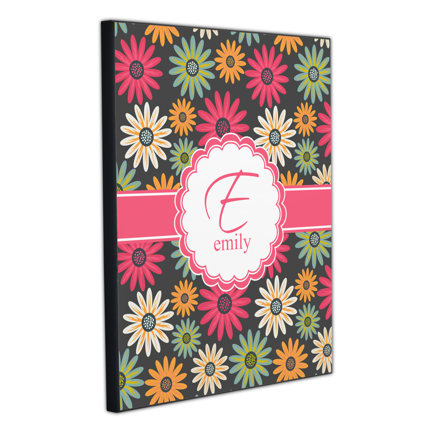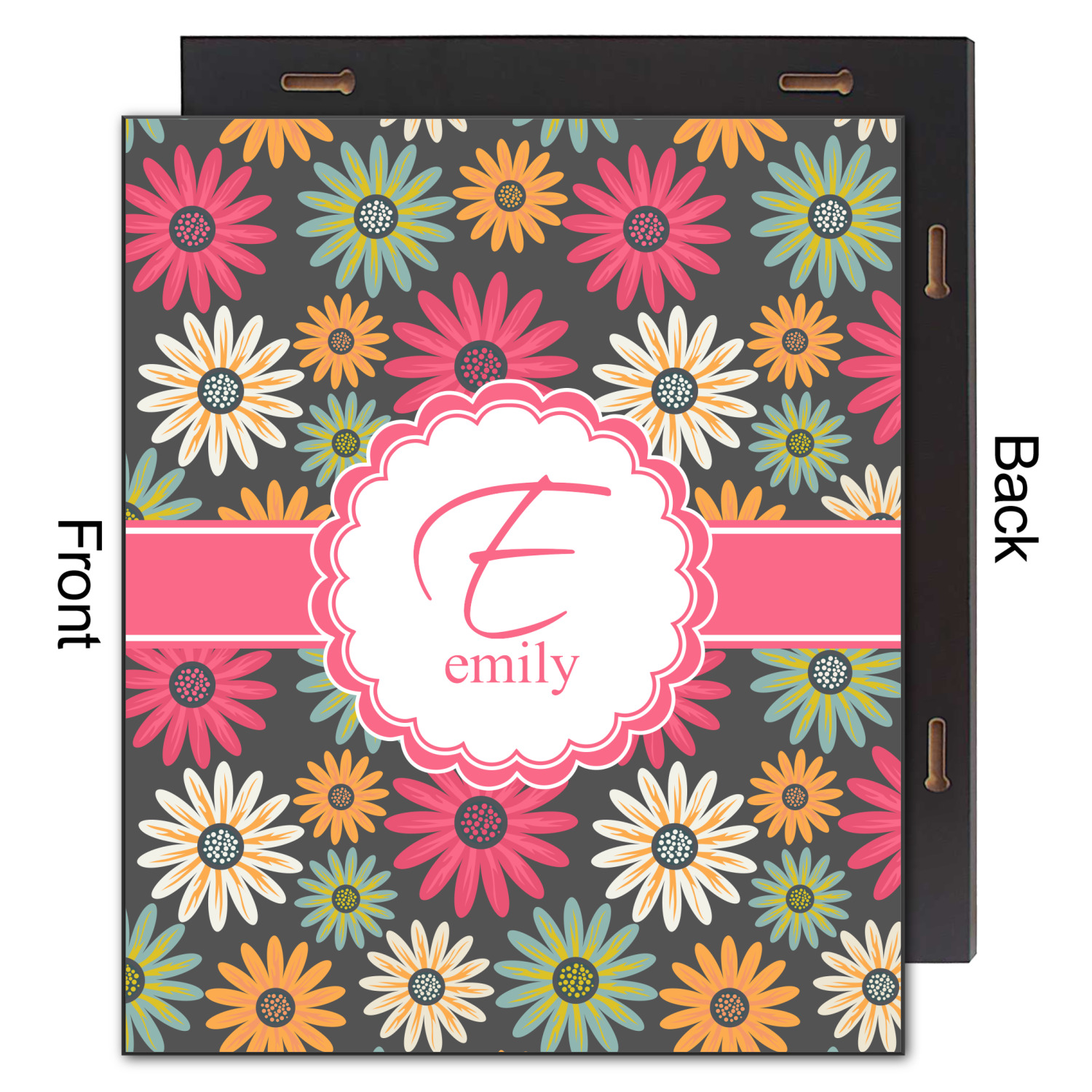 The flowers in this design are are a vibrant mix of fall colors, all on a deep gray background. The design has a classic ribbon in hot pink, the perfect place to add a name for that personal touch to pull the entire design together.