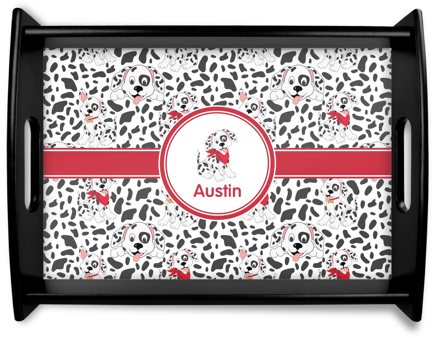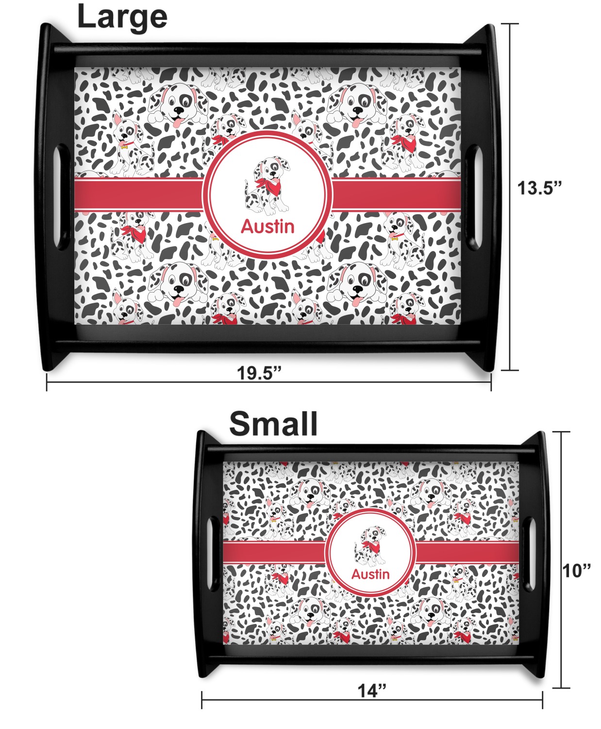 This serving tray with handles features square edges and two rounded sides, creating a very modern look. Each side is fabricated from a beautifully cut, natural wood. The bottom of the interior of the tray displays your customized design in bright, vibrant color. The tray is sold in both a black color and a natural wood look. Each variation of the wood serving tray has two sizes: Small, which is 14" x 10" x 2.25", and Large, which is 19.5" x 13.5" x 2.75".