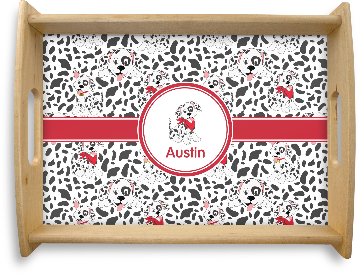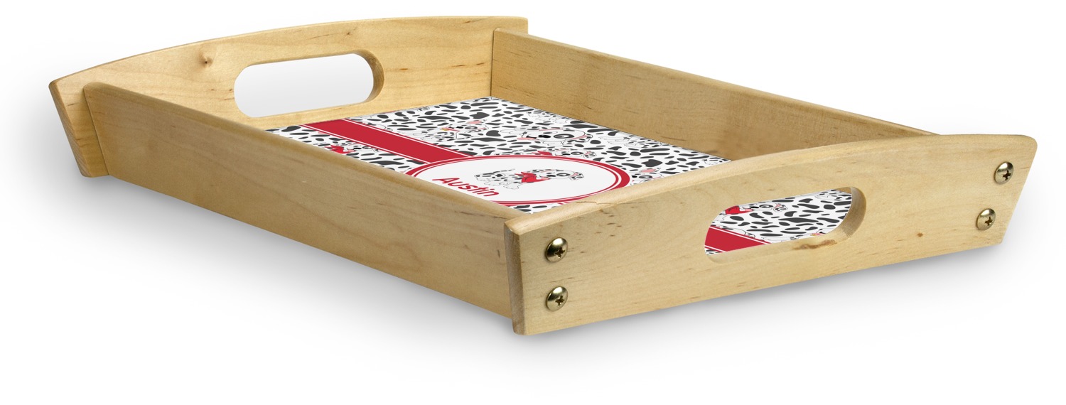 This serving tray with handles features square edges and two rounded sides, creating a very modern look. Each side is fabricated from a beautifully cut, natural wood. The bottom of the interior of the tray displays your customized design in bright, vibrant color. The tray is sold in both a black color and a natural wood look. Each variation of the wood serving tray has two sizes: Small, which is 14" x 10" x 2.25", and Large, which is 19.5" x 13.5" x 2.75".