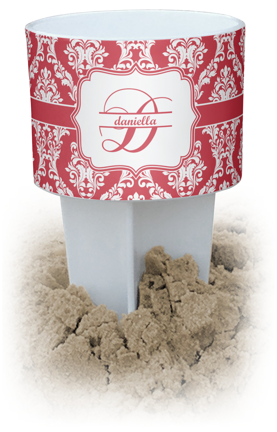This cup holder has a large stake at its bottom that anchors it to the sand or ground below, while the cup holder rests above the stake. The entire drink holder is made of durable plastic and displays your customization around the cup holder portion. We sell these personalized beach spikers in two different colors: black and white.