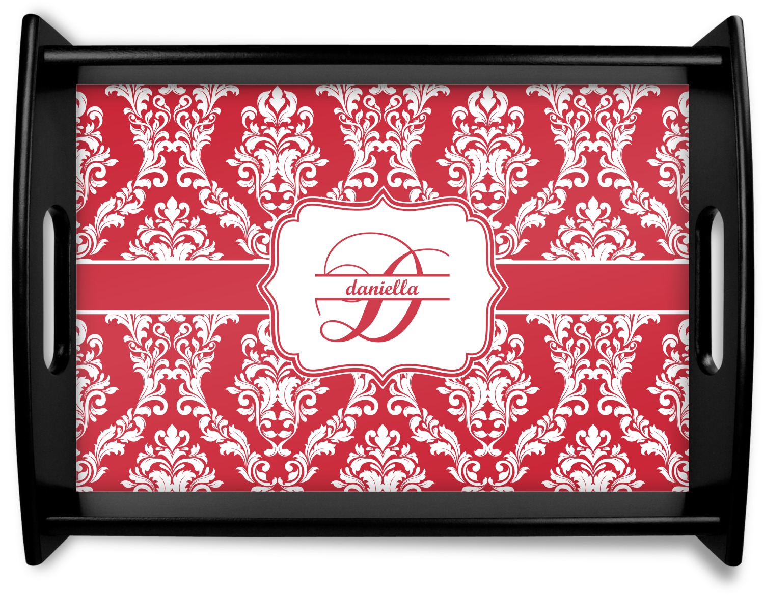 This serving tray with handles features square edges and two rounded sides, creating a very modern look. Each side is fabricated from a beautifully cut, natural wood. The bottom of the interior of the tray displays your customized design in bright, vibrant color. The tray is sold in both a black color and a natural wood look. Each variation of the wood serving tray has two sizes: Small, which is 14" x 10" x 2.25", and Large, which is 19.5" x 13.5" x 2.75".