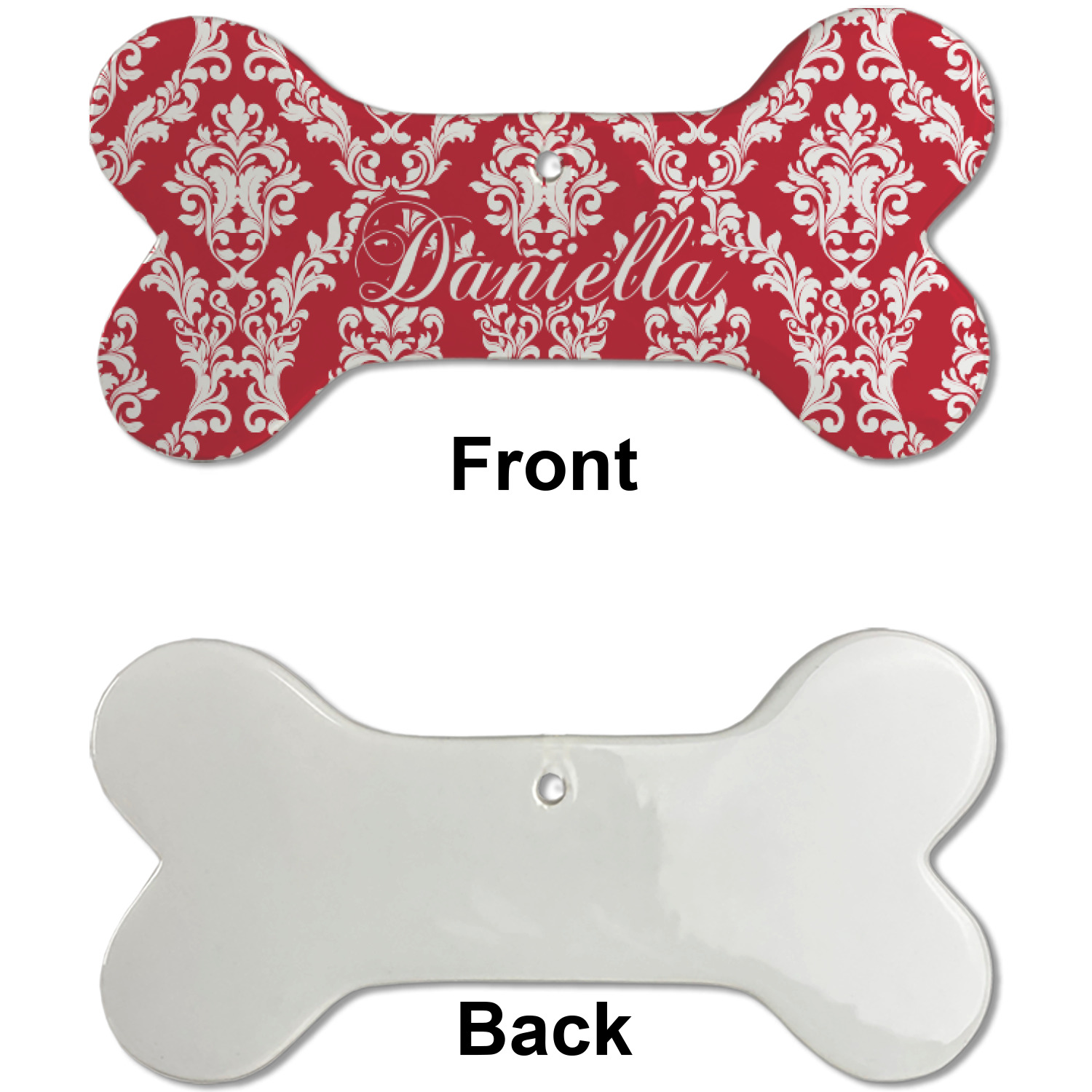 Our dog Christmas ornaments are a ceramic material with a bone-shaped structure hung horizontally. We offer two printing styles to personalize your furry friend's ornament! Choose a one-sided printing, perfect for wall decor, memorial accessory, or doghouse nameplate! Create a double-sided ornament perfect for adorning the Christmas tree. Each dog bone ornament is approximately 4.75" x 2.25" and is printed here in the USA.