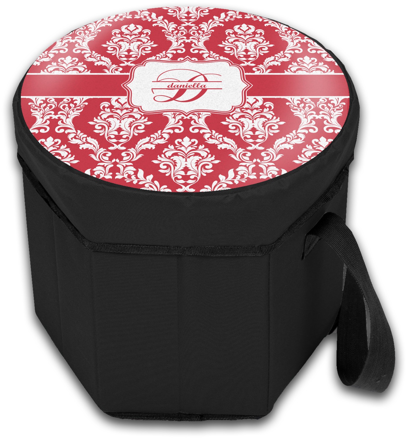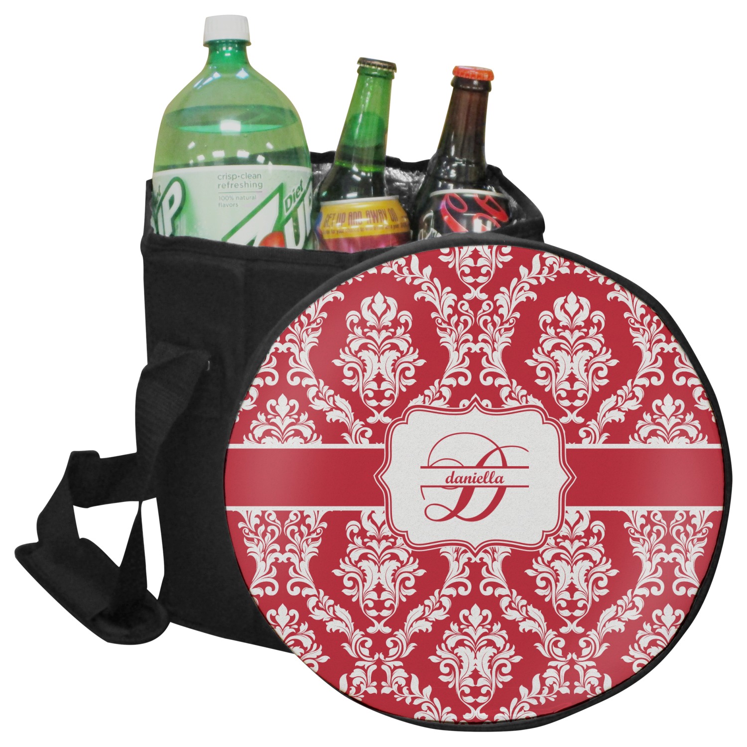 Our collapsible insulated coolers feature a unique six-sided hexagon shape, are lightweight, durable and can be turned into a seat. This cooler is fully insulated with silver foil lining to keep food and drinks hot or cold, and has a 12-quart capacity. Although this cooler collapses for easy transport, hidden inside are composition panels made of sturdy wood that give the frame strength and allow this cooler to be used as a seat. Simply sit down on the personalized cover and give your legs a break! (Maximum weight capacity of 200 pounds.)