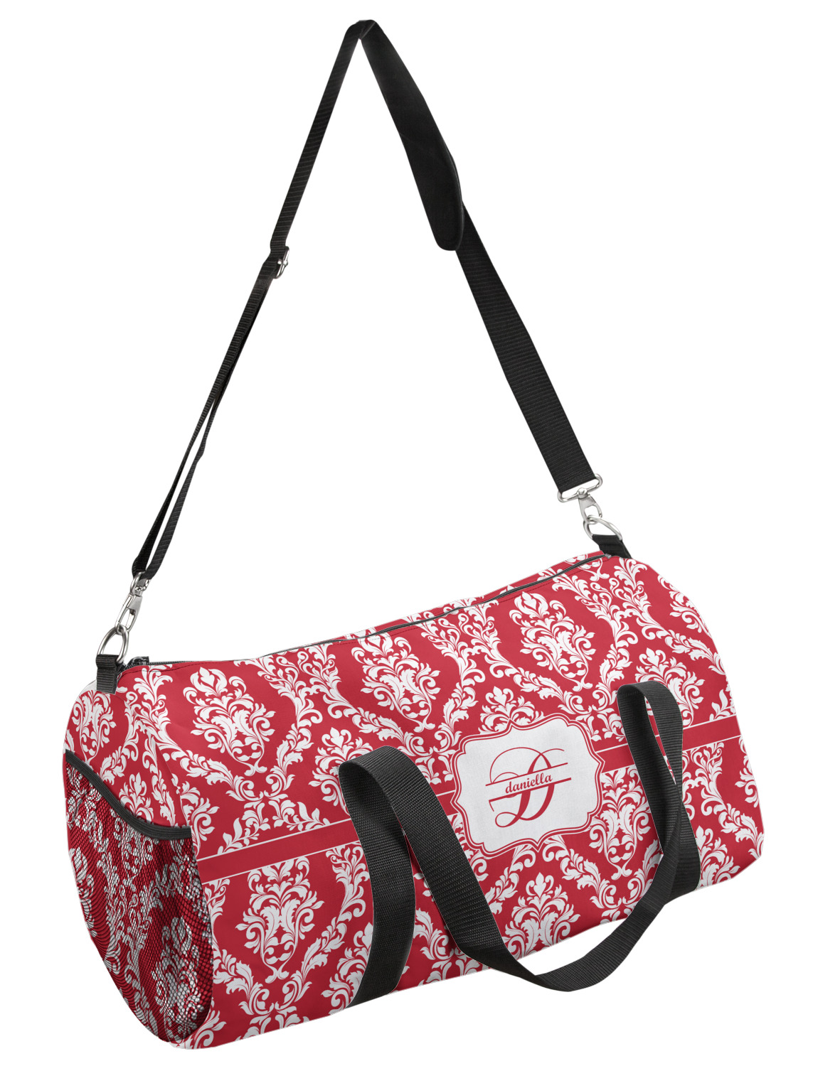 This duffle is a sturdy bag made of a canvas material. It comes in two sizes: Small (19"W x 9.5"H x 9.5"D) and Large (23"W x 12"H x 12"D). The bag is a cylindrical shape with a black adjustable strap and two handles. On one side is an elastic pouch to put a waterbottle or other small item. Your product will be sublimated with your design and is able to be designed on the front, back, and sides. Be sure to remember that the straps may cut into parts of your design if you upload your own artwork.