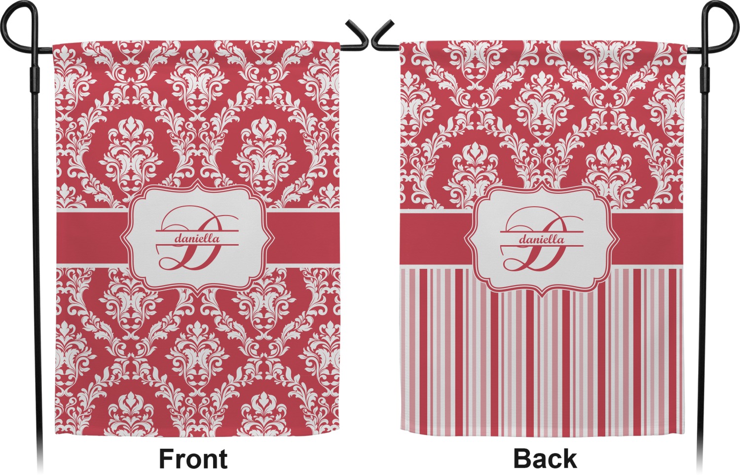 These custom garden flags are made of a durable, double-ply, polyester weave, allowing them to withstand the elements year round. The small flags measure at approximately 12 by 18 inches. The large flags measure out to 28 by 37 inches. You can order these decorative flags with your customization printed on the front only, or the front and back.