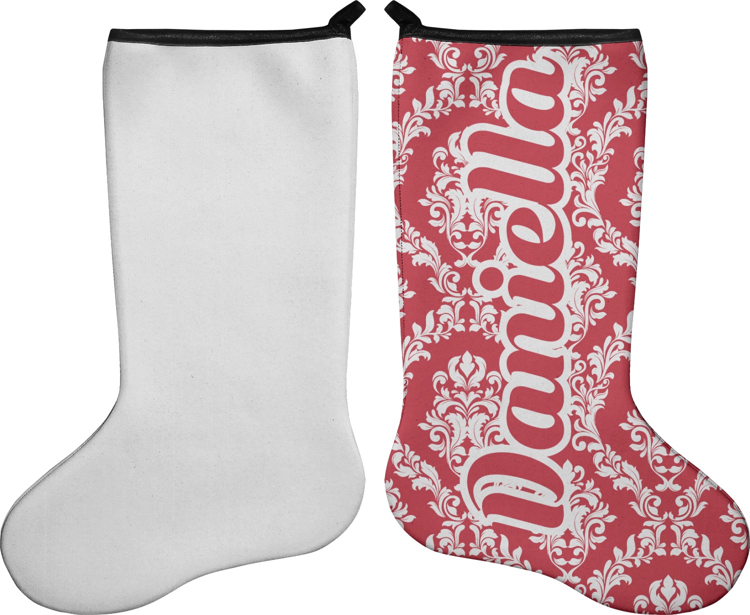 These 17" x 11" stockings are made of neoprene and have a black trim to give them a fantastic finished look. Your very own design is printed right onto the stocking, either single sided with white on the back or double sided where can use the same or different designs / patterns on the front and the back - the choice is yours. At the top of the stocking is a 2" loop for hanging.