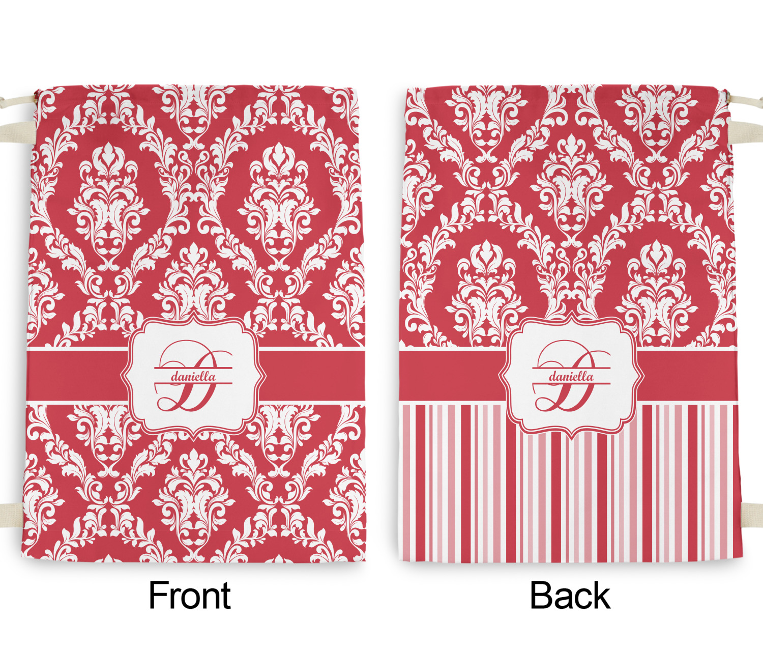 Carry your laundry in style with these customized laundry bags. Available in two sizes, featuring a natural colored woven strap and a cinch cord, these bags hold a lot of clothes or anything else you want to fit in them.