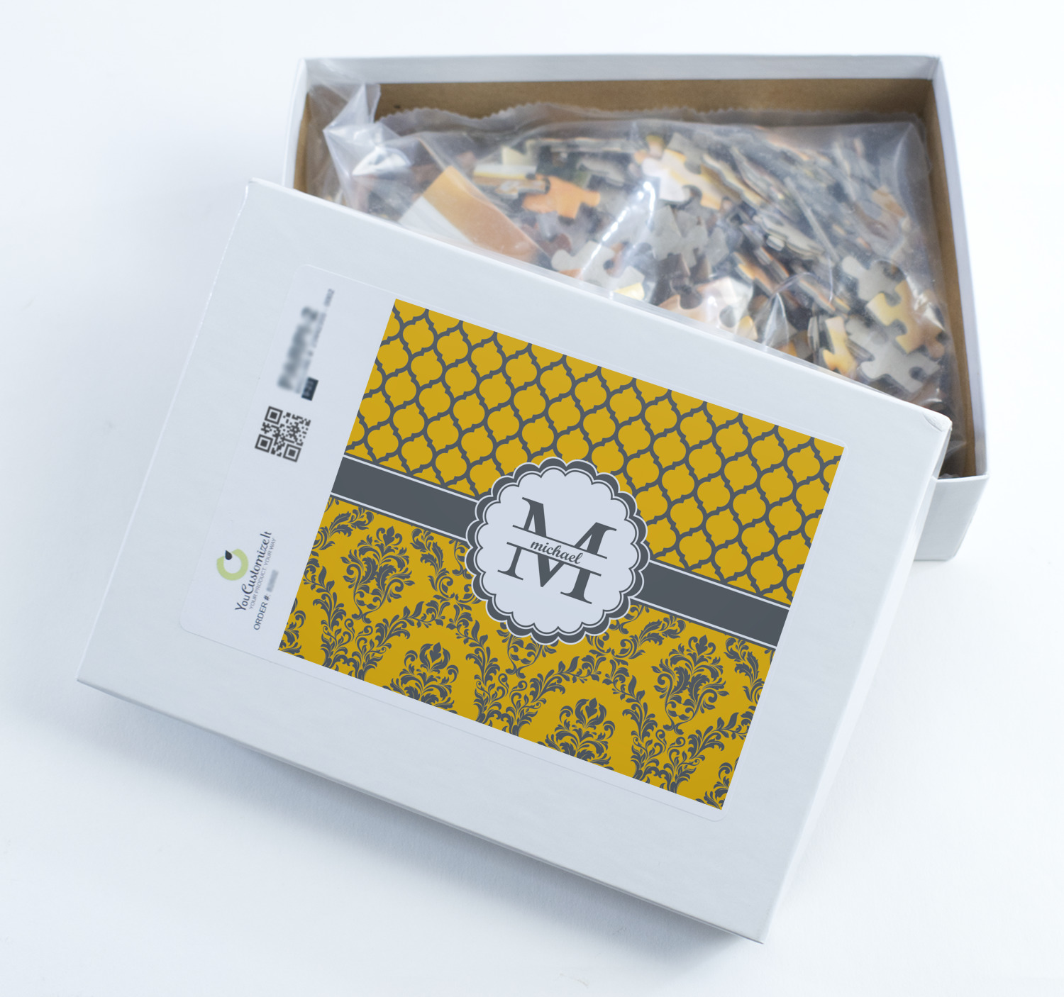 Depending on the look you are trying to achieve, you can add; a thematic pattern or background, with a photo in a frame and text or personalization to your puzzle. Basically if you can imagine it, you can design it!