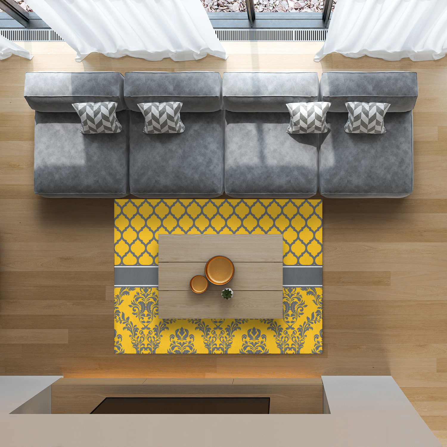 What a beautiful color combination. Introducing a gorgeous muted gold / yellow paired with a heather dove grey. The top of the design is inspired by a classic Moroccan pattern. Using yellow outlined in grey is a very unique color combination on a traditional design. The bottom half of the design stays true to tradition with a beautiful worldly damask pattern. Unique, traditional and worldly come together to form a very rich and regal look. A wide band of dove grey outlined in white bring both patterns together.