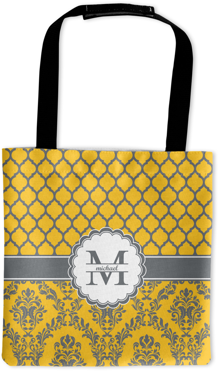 What a beautiful color combination. Introducing a gorgeous muted gold / yellow paired with a heather dove grey. The top of the design is inspired by a classic Moroccan pattern. Using yellow outlined in grey is a very unique color combination on a traditional design. The bottom half of the design stays true to tradition with a beautiful worldly damask pattern. Unique, traditional and worldly come together to form a very rich and regal look. A wide band of dove grey outlined in white bring both patterns together.