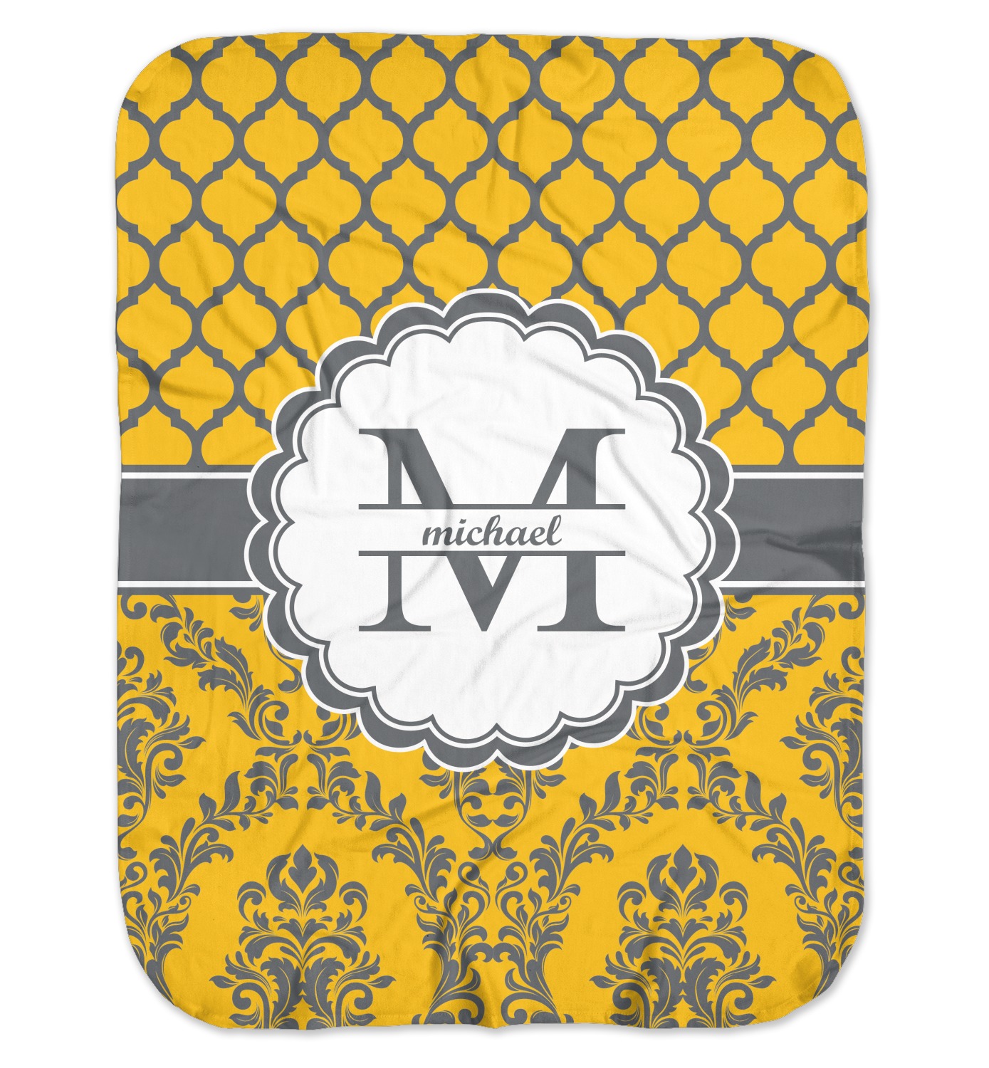 What a beautiful color combination. Introducing a gorgeous muted gold / yellow paired with a heather dove grey. The top of the design is inspired by a classic Moroccan pattern. Using yellow outlined in grey is a very unique color combination on a traditional design. The bottom half of the design stays true to tradition with a beautiful worldly damask pattern. Unique, traditional and worldly come together to form a very rich and regal look. A wide band of dove grey outlined in white bring both patterns together.