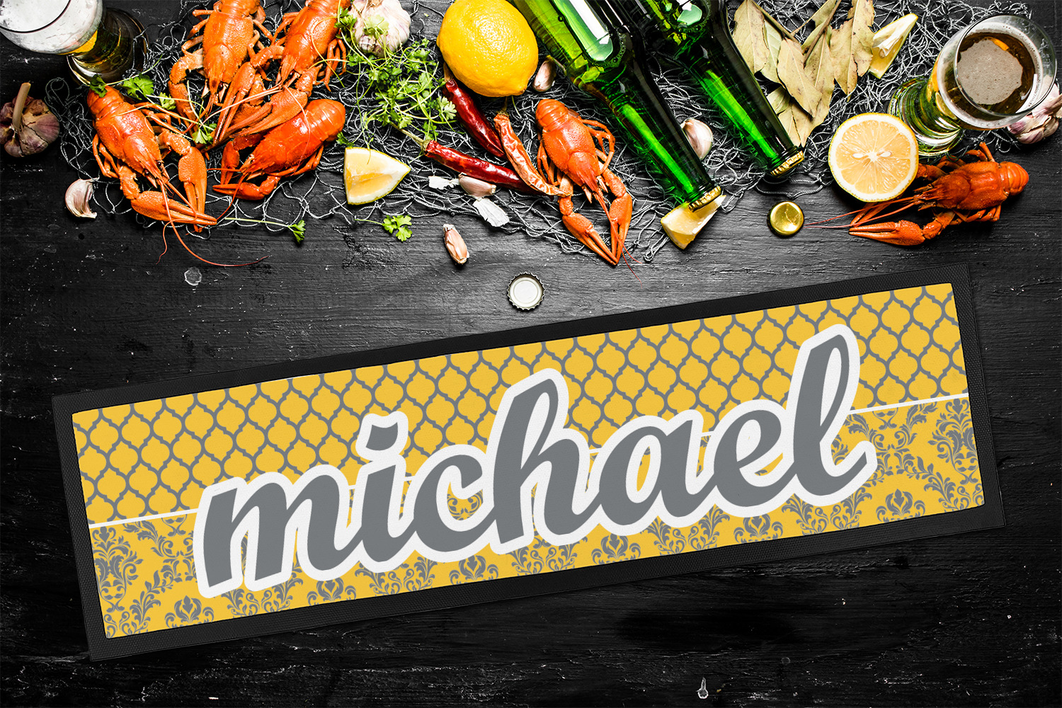 What a beautiful color combination. Introducing a gorgeous muted gold / yellow paired with a heather dove grey. The top of the design is inspired by a classic Moroccan pattern. Using yellow outlined in grey is a very unique color combination on a traditional design. The bottom half of the design stays true to tradition with a beautiful worldly damask pattern. Unique, traditional and worldly come together to form a very rich and regal look. A wide band of dove grey outlined in white bring both patterns together.