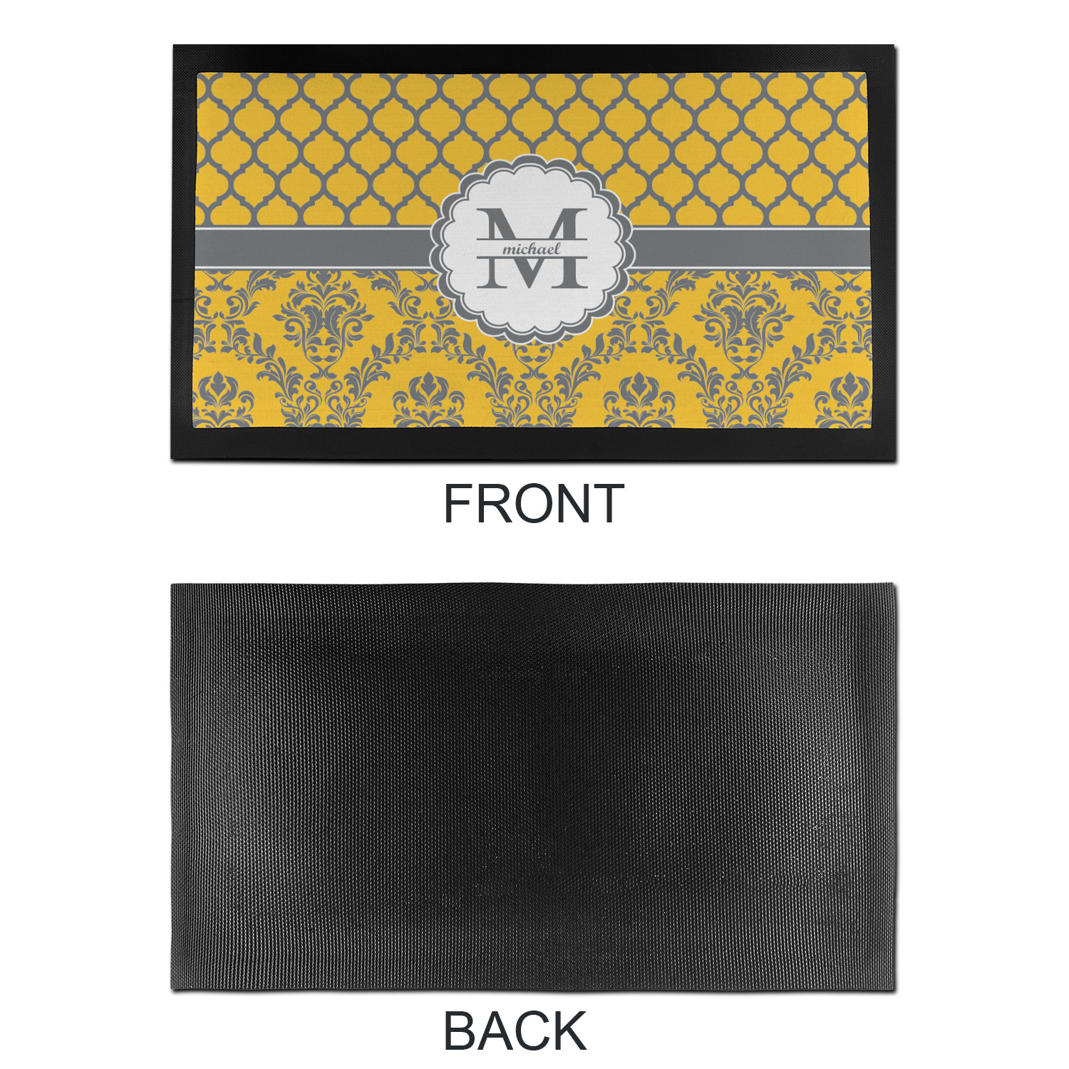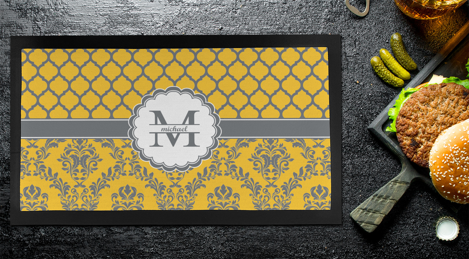 What a beautiful color combination. Introducing a gorgeous muted gold / yellow paired with a heather dove grey. The top of the design is inspired by a classic Moroccan pattern. Using yellow outlined in grey is a very unique color combination on a traditional design. The bottom half of the design stays true to tradition with a beautiful worldly damask pattern. Unique, traditional and worldly come together to form a very rich and regal look. A wide band of dove grey outlined in white bring both patterns together.