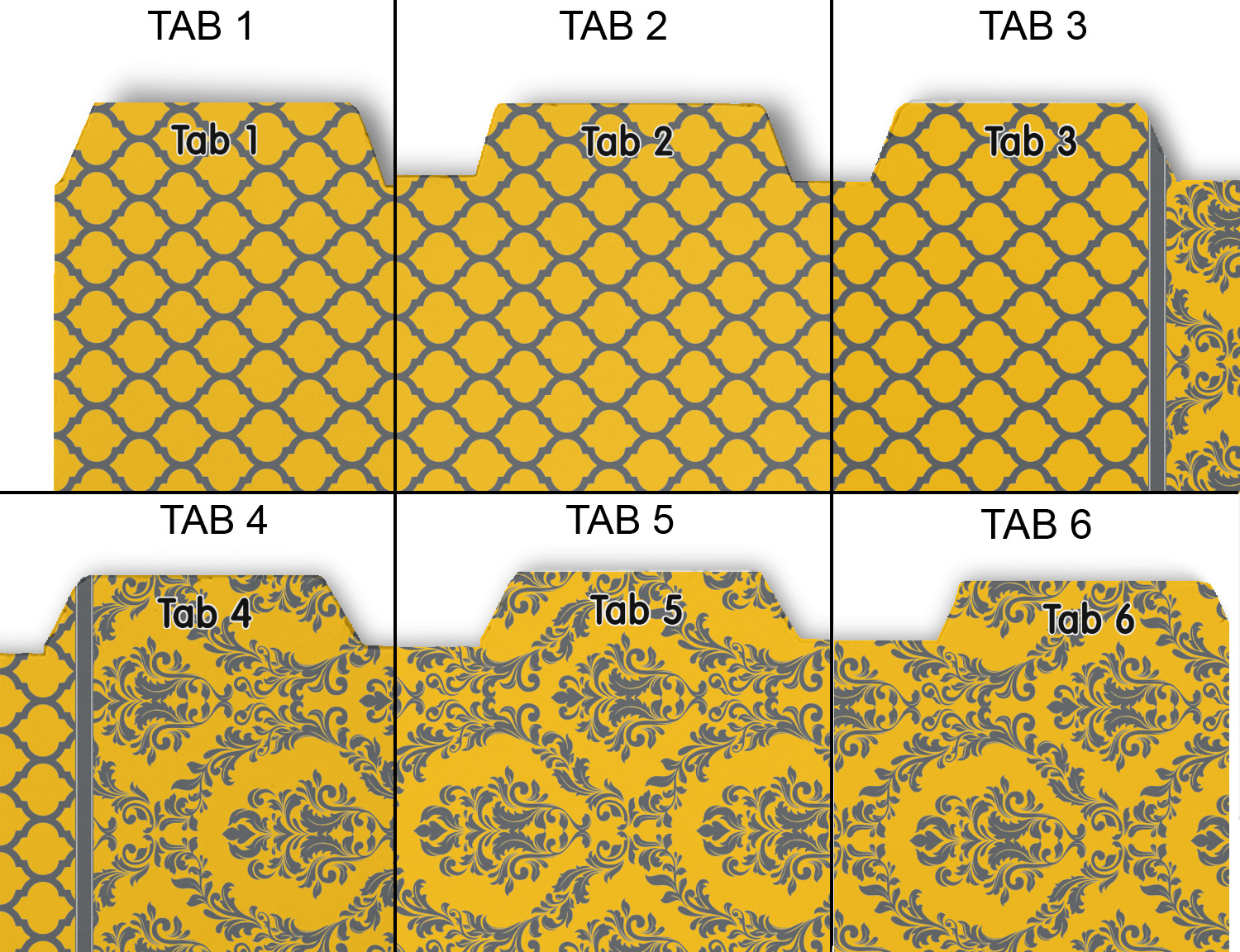 Whether you use binders at school or at work, we have designs to suit all of them. Available in 5 or 6 tab sets, you are sure to find a set to suit your needs. The back of each one is white and can be used to take notes, write vital information on, etc.