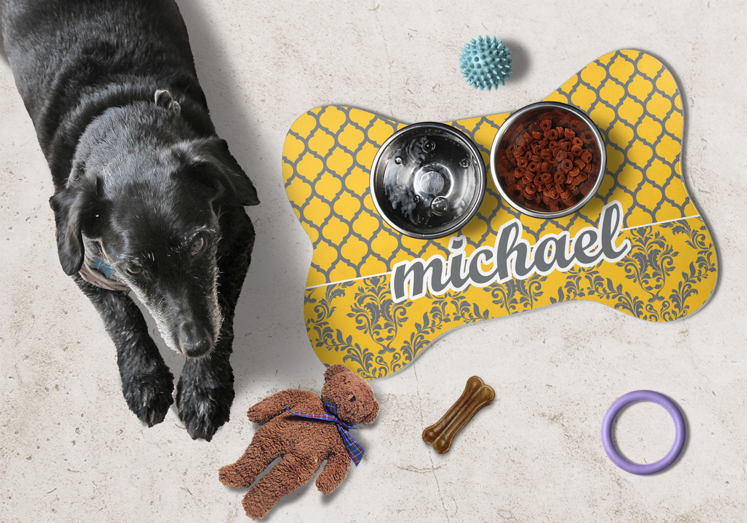 If you are purchasing a pet food mat, consider a customized dog bowl, dog collar, a bone-shaped dog tag, or any other pet supplies to match! Check out our Pet Accessories category for even more options! Craft a design that you want to extend to your eating area? Try our Home and Garden category for kitchen decor options!