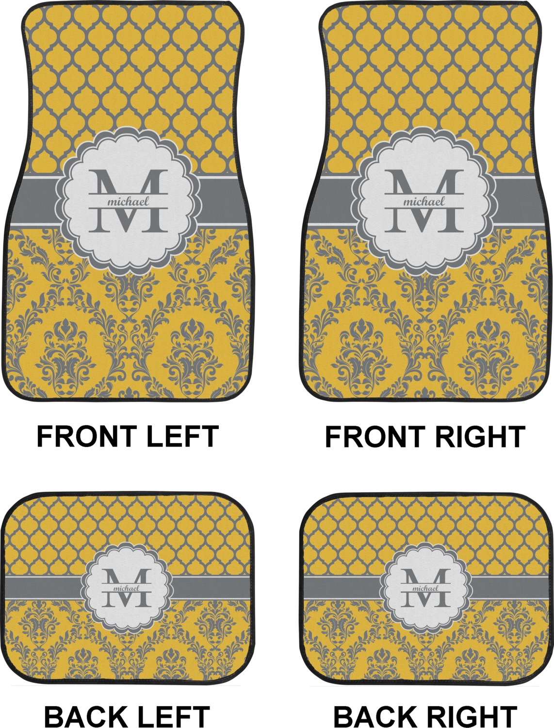We craft our auto floor mats mats from polyester, apply a black finish to the edges, and lined at the bottom to prevent slippage. These mats protect your floors from grass, mud, and any accidental spills. We display your personalized design on the front face of each mat. The sizes of these car floor liners are standardized to provide a versatile fit for all vehicles. The front rows car mats measure at 17 by 26.5 inches, while the back rows measure at 17 by 13 inches. We sell three packages of car floor mats. You can purchase a pair of front row car mats, a pair of back row car mats, or a set of front row and back row car mats. To make an informed purchase, we recommend measuring the surface area of your car floors.
