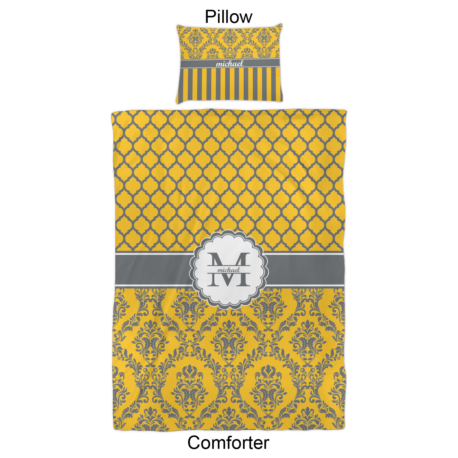 We have hundreds of different design templates for you to choose from Each design can be customized to your exact specifications. Not only can you customize the comforter, but you can also customize each pillow sham e.g. for a queen comforter set you have have Mr & Mrs pillow shams with the last name on comforter.