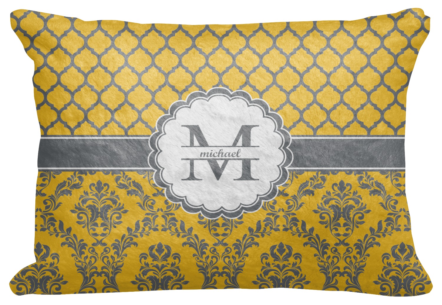 What a beautiful color combination. Introducing a gorgeous muted gold / yellow paired with a heather dove grey. The top of the design is inspired by a classic Moroccan pattern. Using yellow outlined in grey is a very unique color combination on a traditional design. The bottom half of the design stays true to tradition with a beautiful worldly damask pattern. Unique, traditional and worldly come together to form a very rich and regal look. A wide band of dove grey outlined in white bring both patterns together.