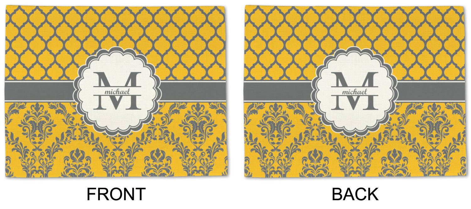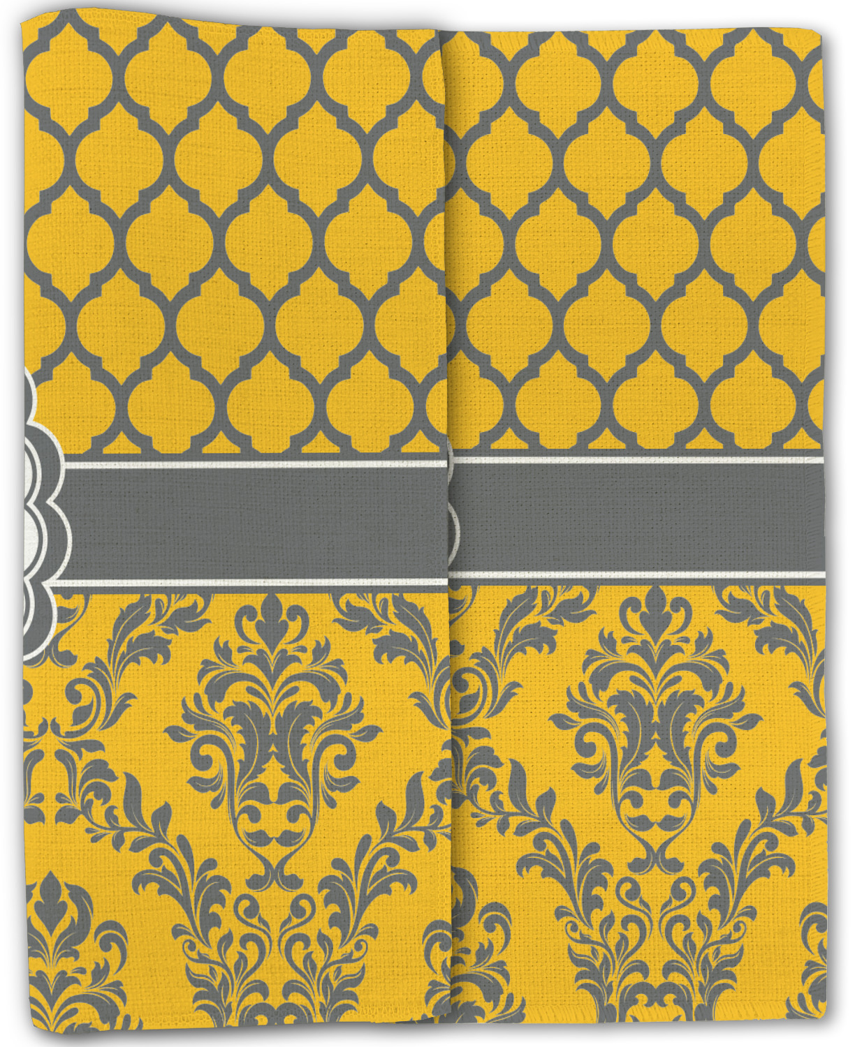 What a beautiful color combination. Introducing a gorgeous muted gold / yellow paired with a heather dove grey. The top of the design is inspired by a classic Moroccan pattern. Using yellow outlined in grey is a very unique color combination on a traditional design. The bottom half of the design stays true to tradition with a beautiful worldly damask pattern. Unique, traditional and worldly come together to form a very rich and regal look. A wide band of dove grey outlined in white bring both patterns together.