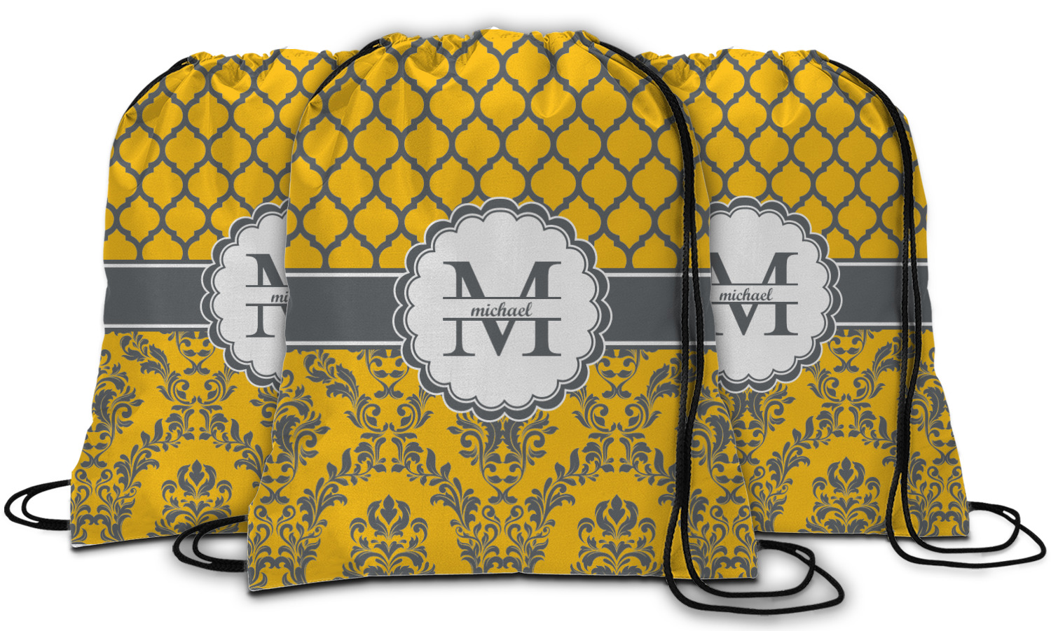 Our drawstring backpacks are custom made for you here in the USA. We offer a great selection of cinch bags and it is your choice to personalize them with the text of your choice, in the format of your choice i.e. monogram, name, initial, name & initial. We offer many different patterns and prints; and many of the patterns are available in 45 different colors.