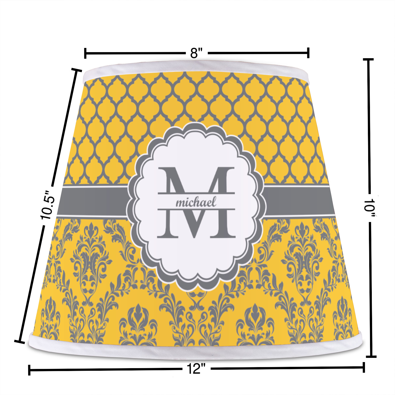 The base of this lampshade is 12 inches in diameter, and the top spans 8 inches in diameter. The total height of the lampshade is 10 inches. The angled nature of this custom lampshade concentrates the light, making it ideal for smaller spaces. This lampshade is made of matte, polyfilm, and displays your customization in its middle. The top and bottom of this colorful lamp shade are lined with a white fabric ribbon (which can be replaced with black inside the design studio) which frames your design and creates a sophisticated finish. As an UNO fitter lampshade, this unique lamp shade will fit a variety of bases.