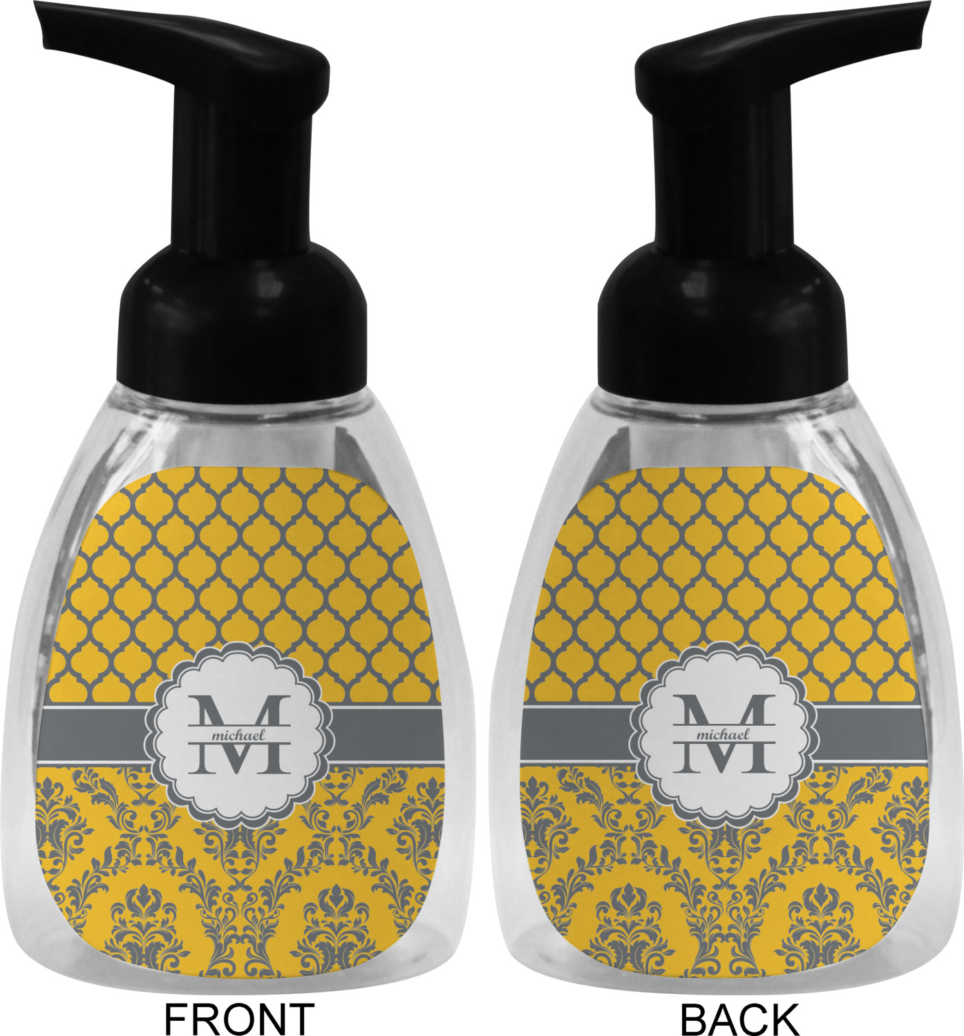 This soap dispenser is made of a robust plastic and has a clear base. The included soap pump is available in black or white color. This dispenser is 6.5 inches tall, 3 inches wide, and 2 inches deep. We display your customized designs on the front and back sides of these foaming hand soap dispensers.