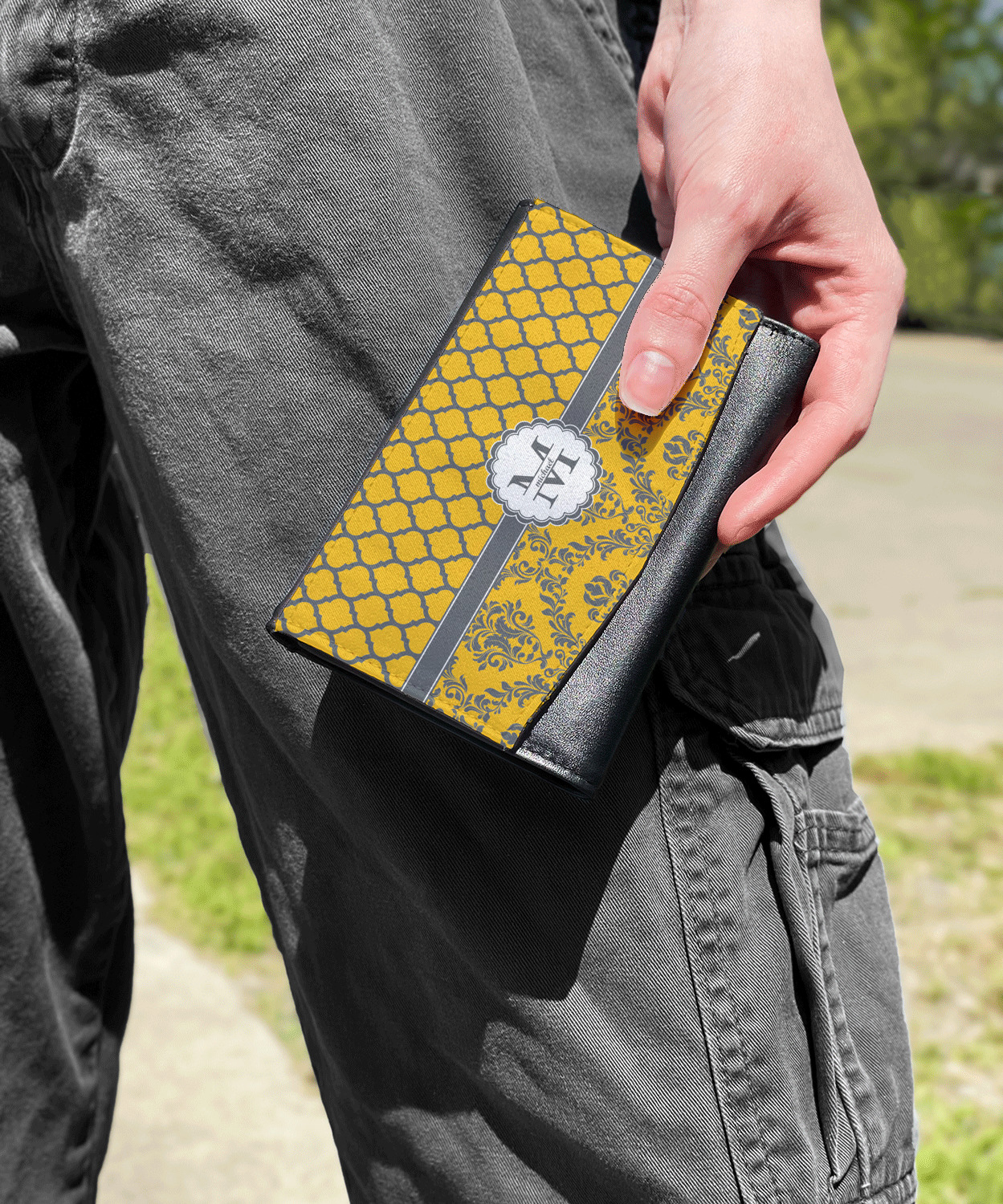 The compact size of this wallet - 5.5in wide, 3.5in tall and 0.75in thick when folded - makes it perfect to hold in hand and small enough to fit in a clutch or a normal size purse. The outside flap is customized with your choice of artwork and closes with a snap closure - with two different snaps to allow it to be adjusted when storing more items - to securely fasten the flap.