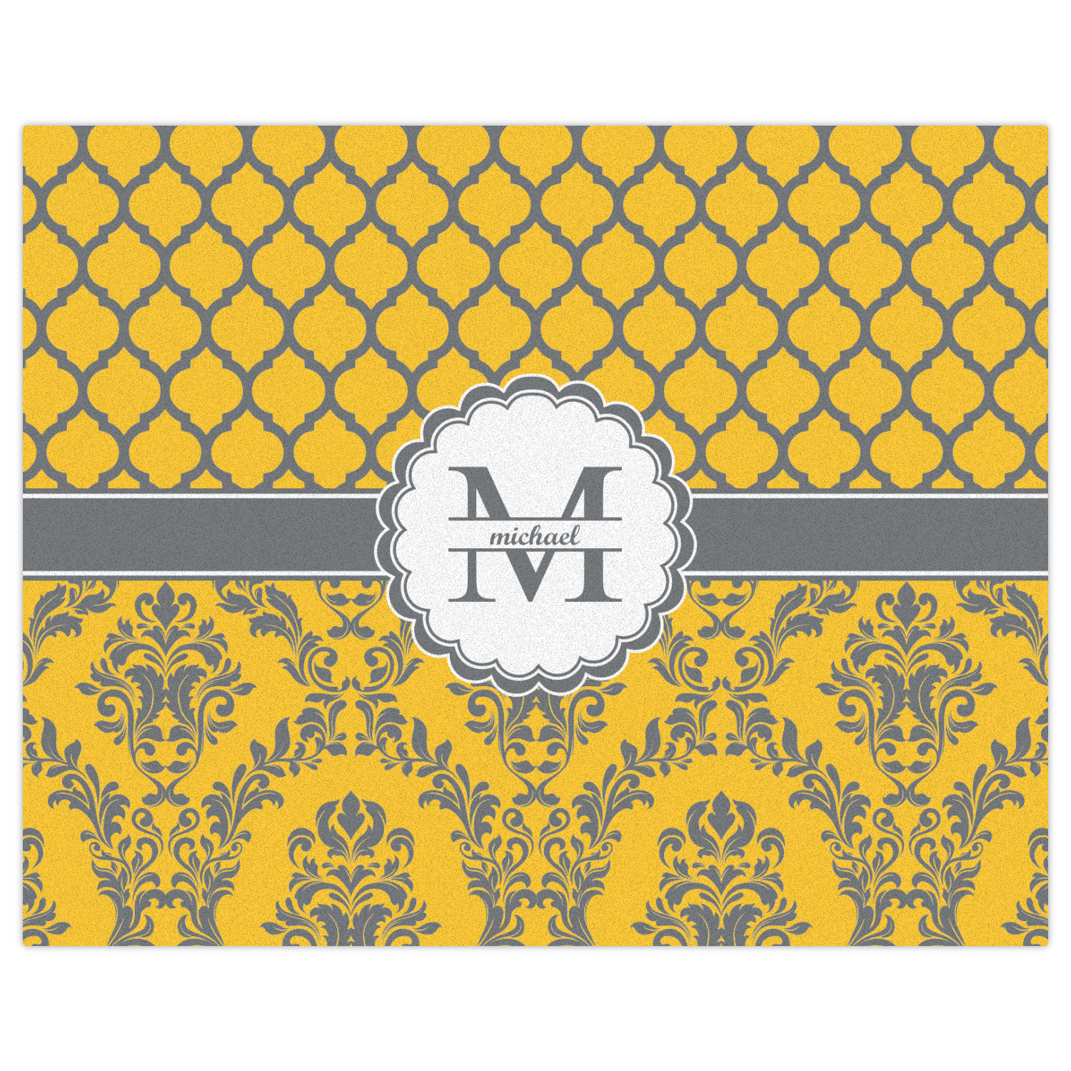 What a beautiful color combination. Introducing a gorgeous muted gold / yellow paired with a heather dove grey. The top of the design is inspired by a classic Moroccan pattern. Using yellow outlined in grey is a very unique color combination on a traditional design. The bottom half of the design stays true to tradition with a beautiful worldly damask pattern. Unique, traditional and worldly come together to form a very rich and regal look. A wide band of dove grey outlined in white bring both patterns together.