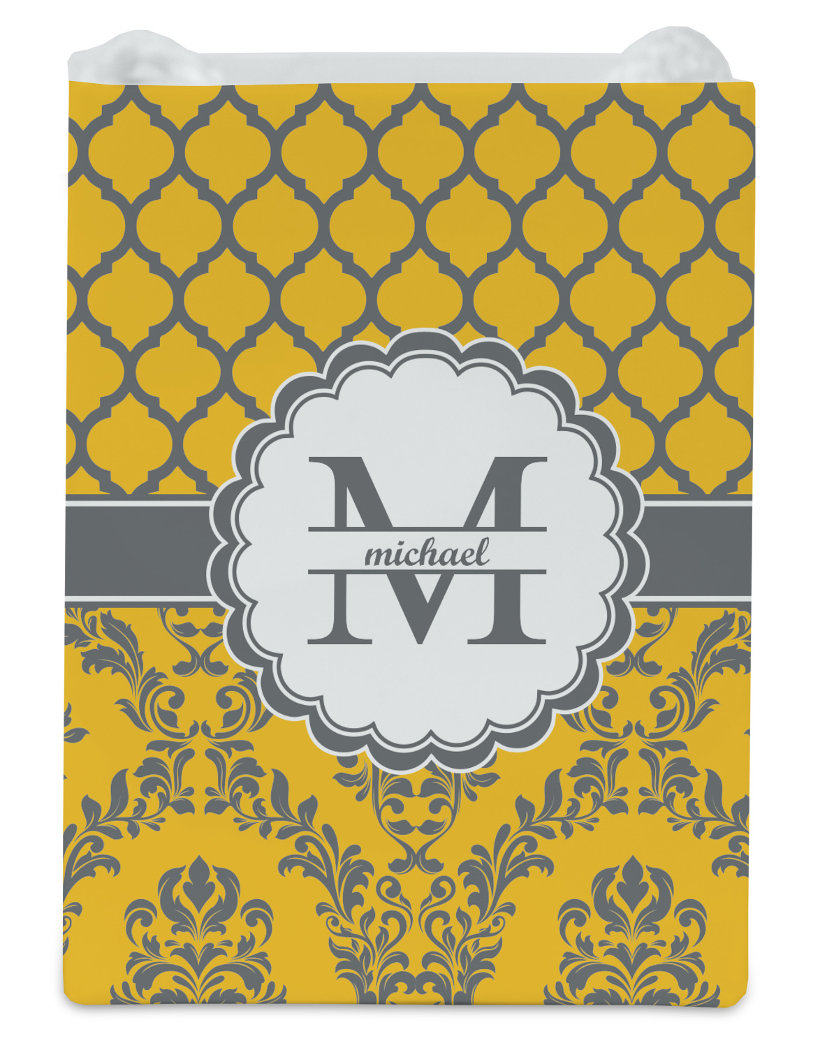 What a beautiful color combination. Introducing a gorgeous muted gold / yellow paired with a heather dove grey. The top of the design is inspired by a classic Moroccan pattern. Using yellow outlined in grey is a very unique color combination on a traditional design. The bottom half of the design stays true to tradition with a beautiful worldly damask pattern. Unique, traditional and worldly come together to form a very rich and regal look. A wide band of dove grey outlined in white bring both patterns together.