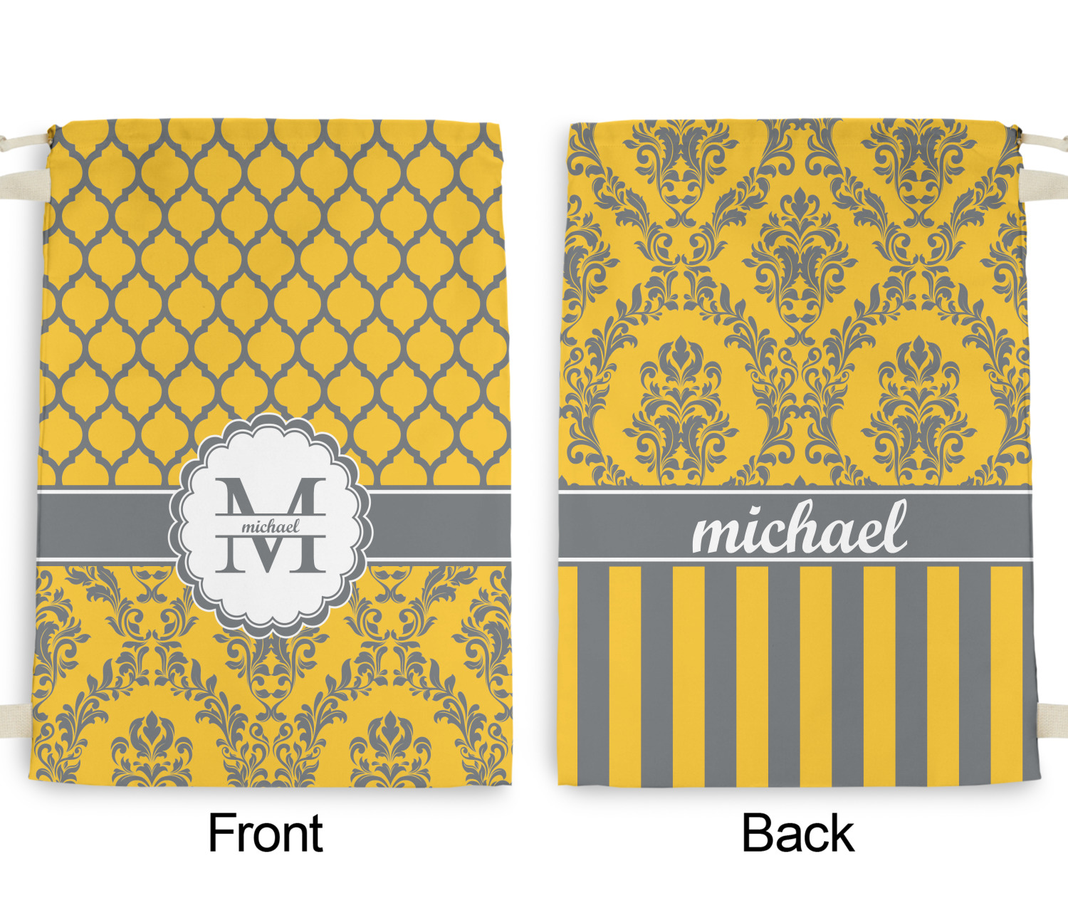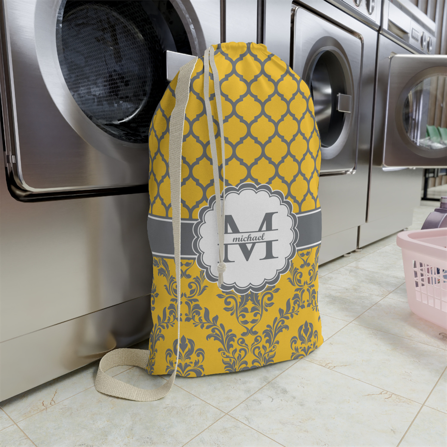 Carry your laundry in style with these customized laundry bags. Available in two sizes, featuring a natural colored woven strap and a cinch cord, these bags hold a lot of clothes or anything else you want to fit in them.