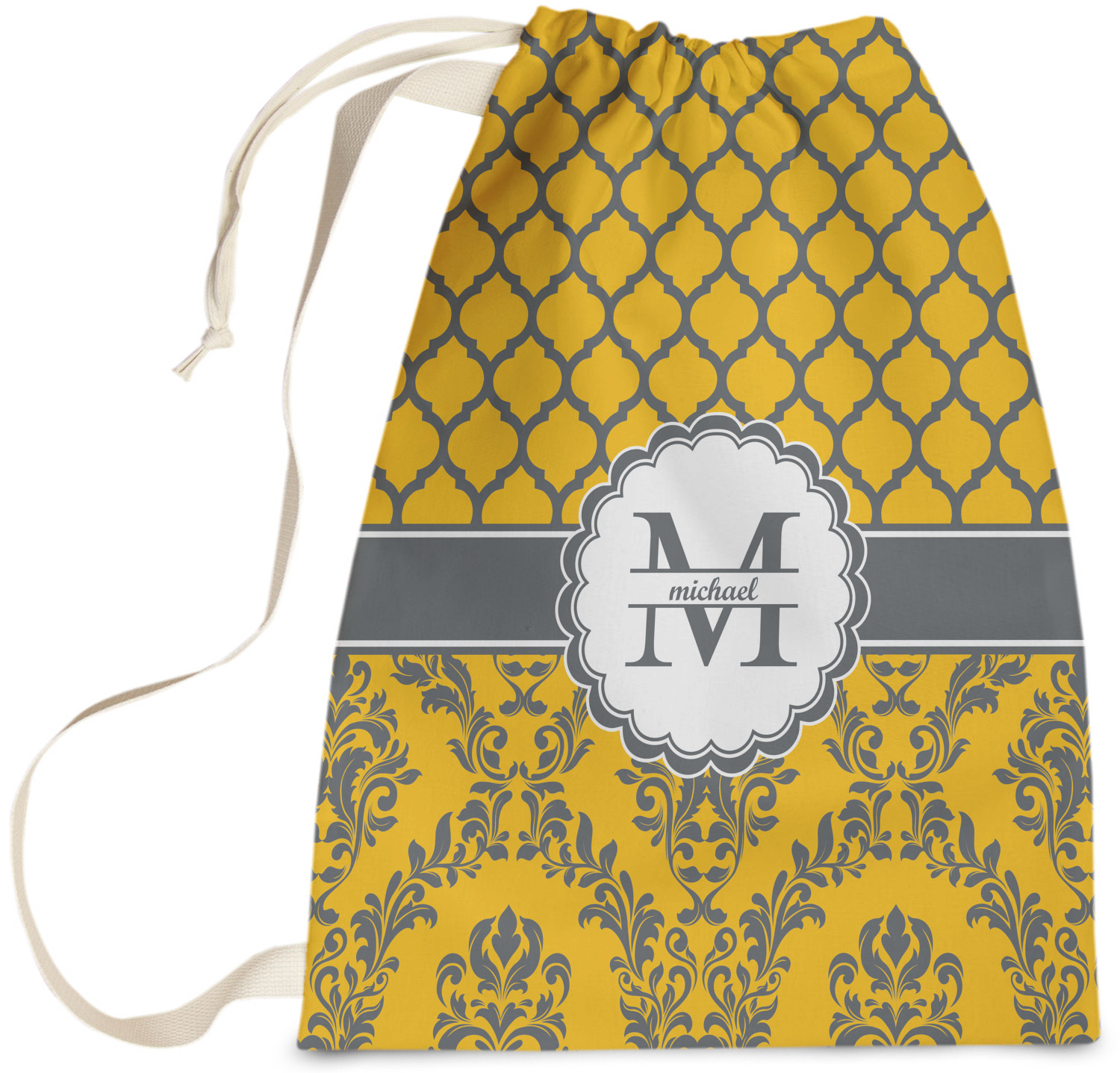Carry your laundry in style with these customized laundry bags. Available in two sizes, featuring a natural colored woven strap and a cinch cord, these bags hold a lot of clothes or anything else you want to fit in them.