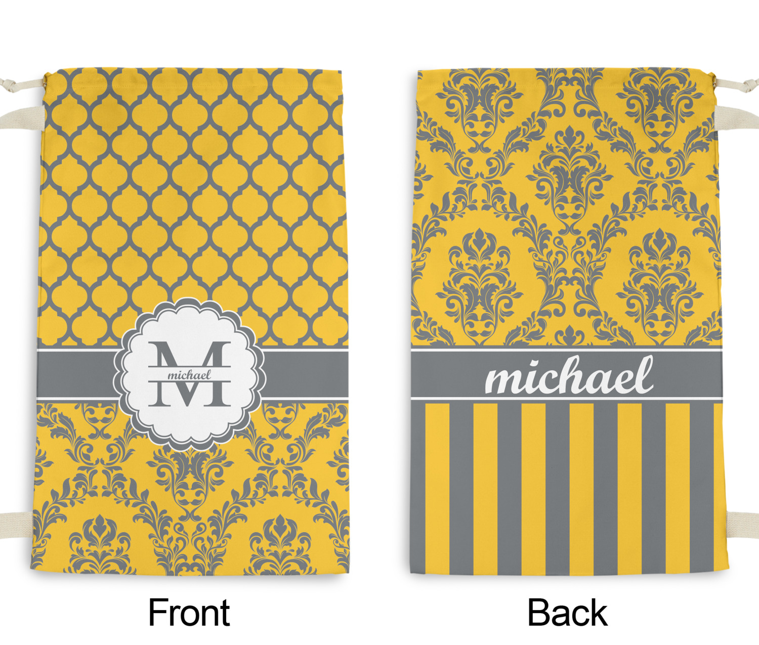 Carry your laundry in style with these customized laundry bags. Available in two sizes, featuring a natural colored woven strap and a cinch cord, these bags hold a lot of clothes or anything else you want to fit in them.