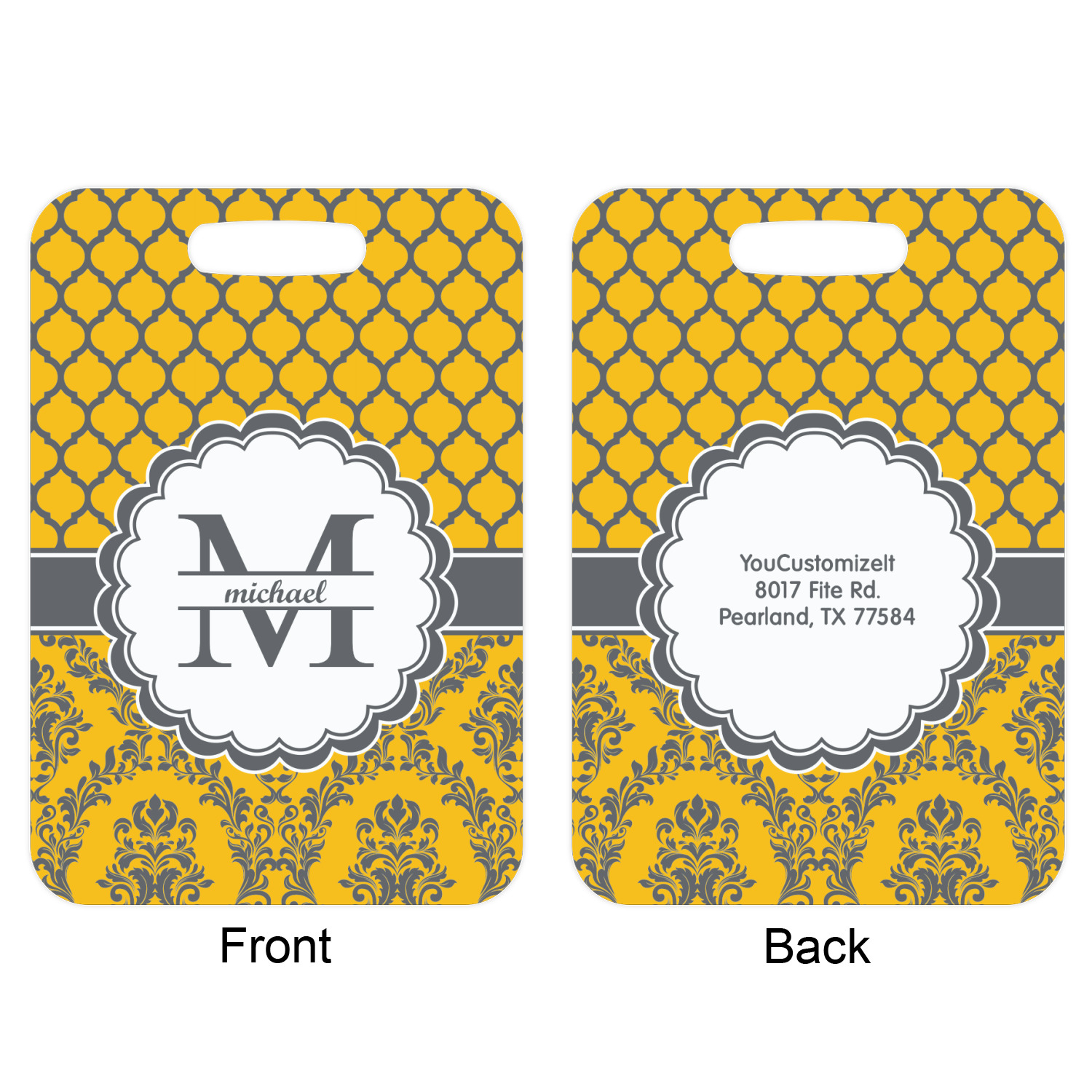 These metal luggage tags are printed on both sides; the front is printed with the design of your choice - and can be personalized with your name, name & initial or your monogram. The back can have as much or as little of your contact information as you desire - your name, your address, city, zip & state, you can also include your phone number and email address. Customize it exactly the way you want it!