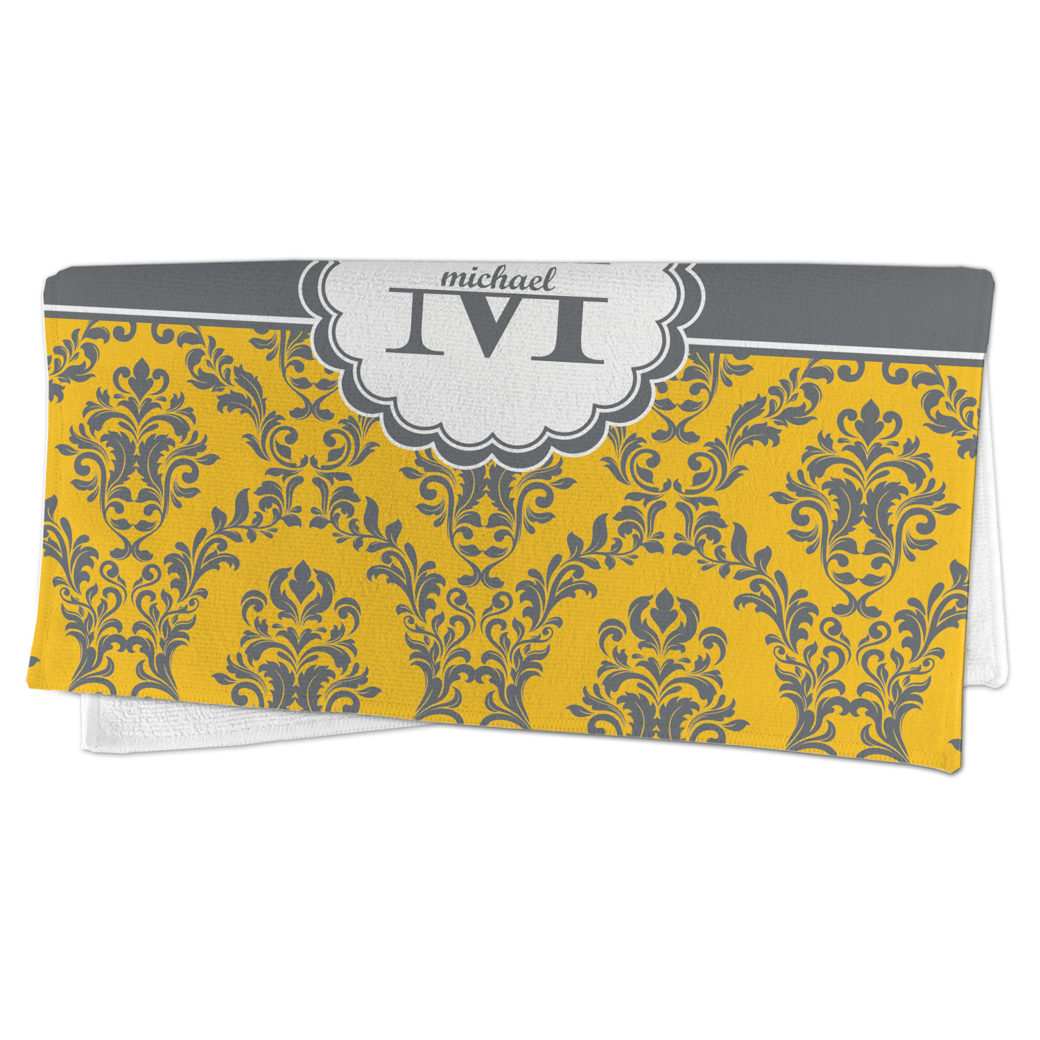 What a beautiful color combination. Introducing a gorgeous muted gold / yellow paired with a heather dove grey. The top of the design is inspired by a classic Moroccan pattern. Using yellow outlined in grey is a very unique color combination on a traditional design. The bottom half of the design stays true to tradition with a beautiful worldly damask pattern. Unique, traditional and worldly come together to form a very rich and regal look. A wide band of dove grey outlined in white bring both patterns together.