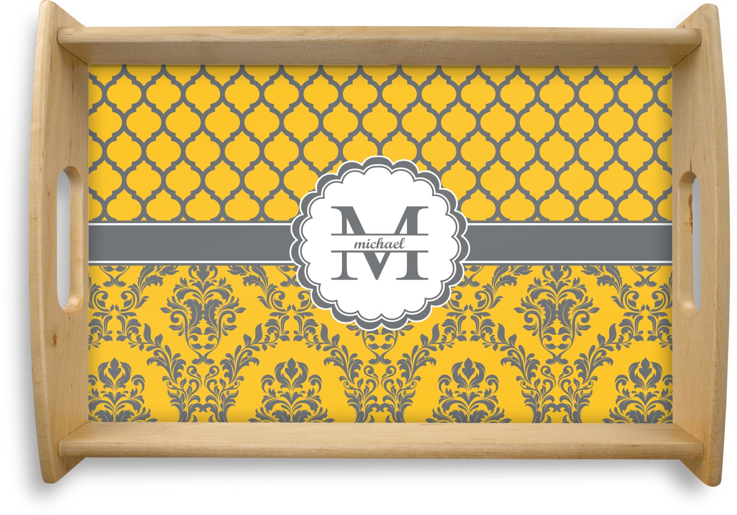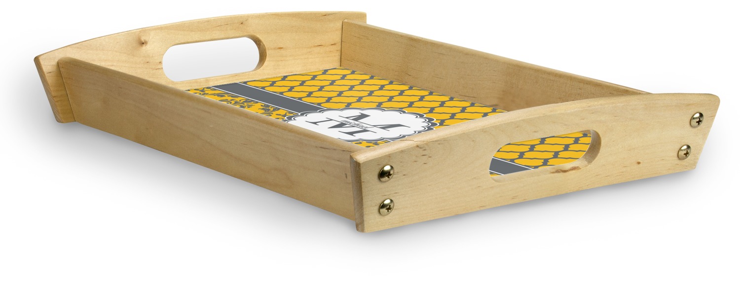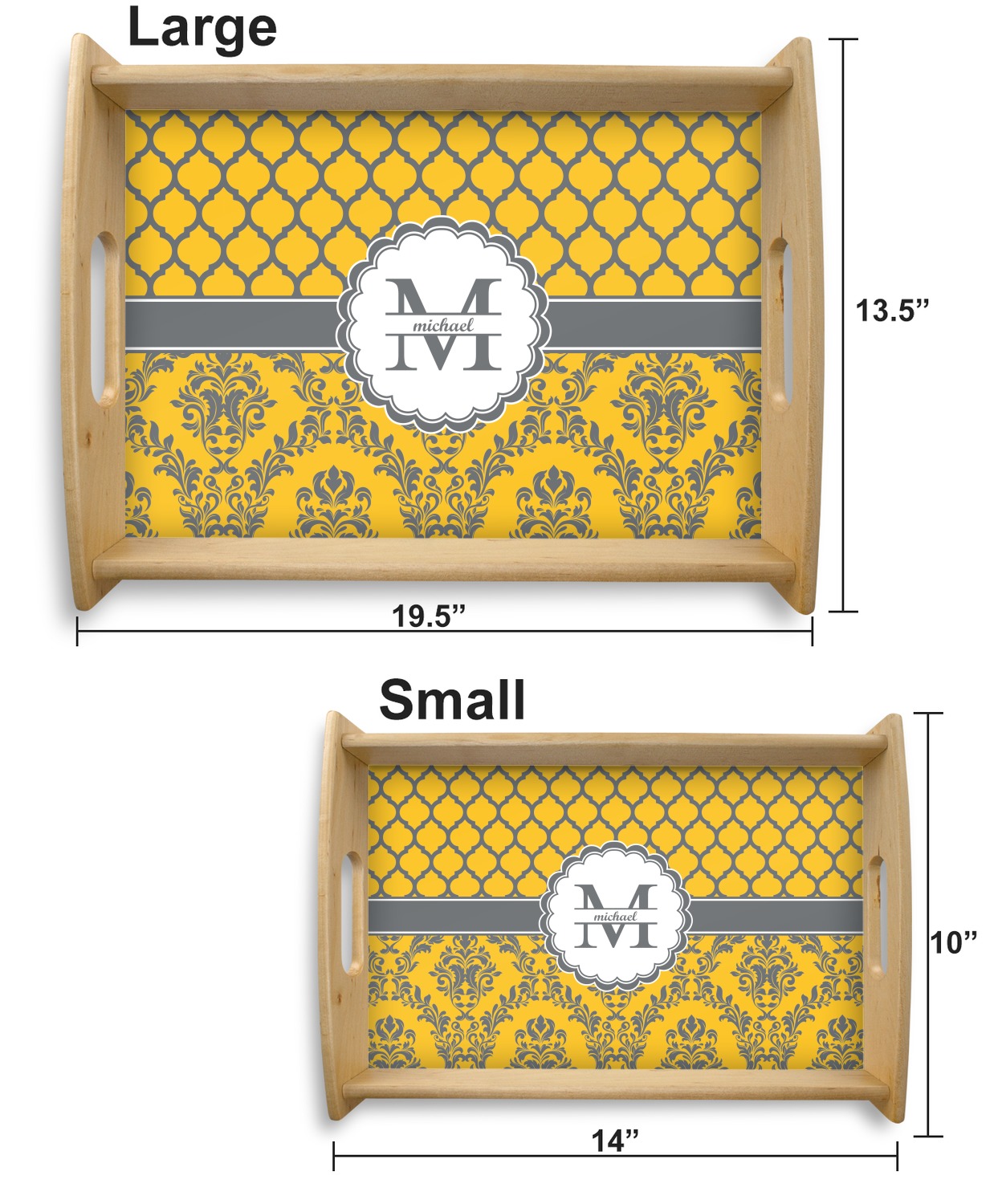 This serving tray with handles features square edges and two rounded sides, creating a very modern look. Each side is fabricated from a beautifully cut, natural wood. The bottom of the interior of the tray displays your customized design in bright, vibrant color. The tray is sold in both a black color and a natural wood look. Each variation of the wood serving tray has two sizes: Small, which is 14" x 10" x 2.25", and Large, which is 19.5" x 13.5" x 2.75".