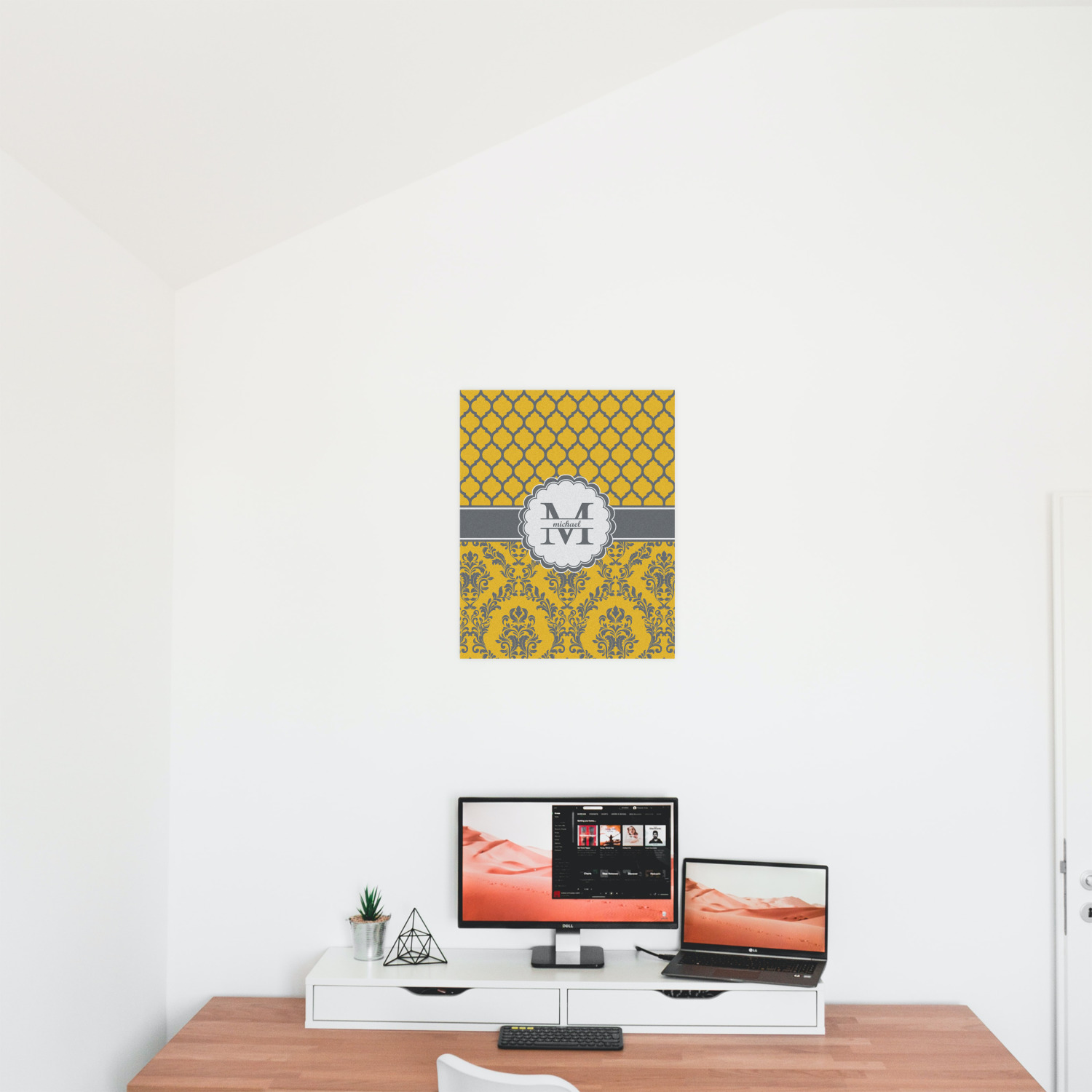 What a beautiful color combination. Introducing a gorgeous muted gold / yellow paired with a heather dove grey. The top of the design is inspired by a classic Moroccan pattern. Using yellow outlined in grey is a very unique color combination on a traditional design. The bottom half of the design stays true to tradition with a beautiful worldly damask pattern. Unique, traditional and worldly come together to form a very rich and regal look. A wide band of dove grey outlined in white bring both patterns together.