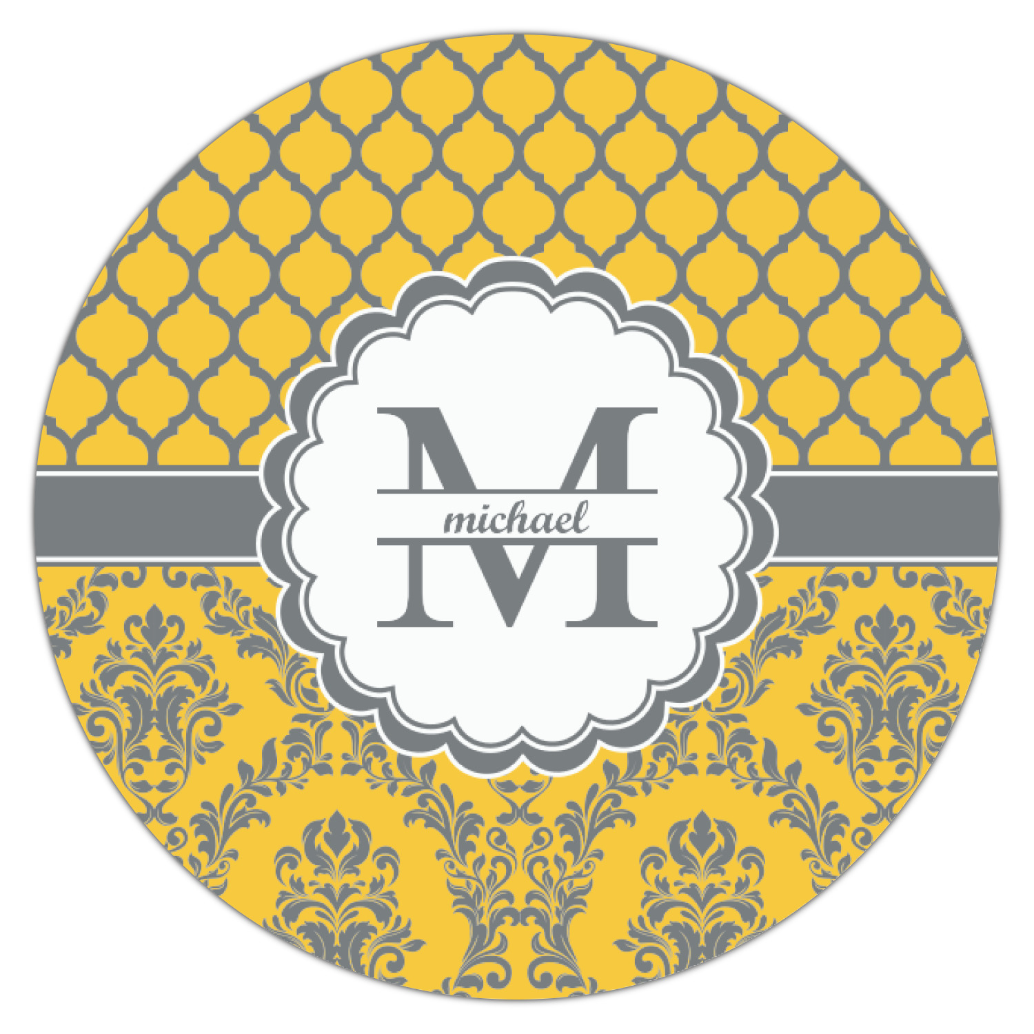 A gorgeous white scallop label trimmed in grey adorns the middle of the design to showcase the personalization of your choosing.