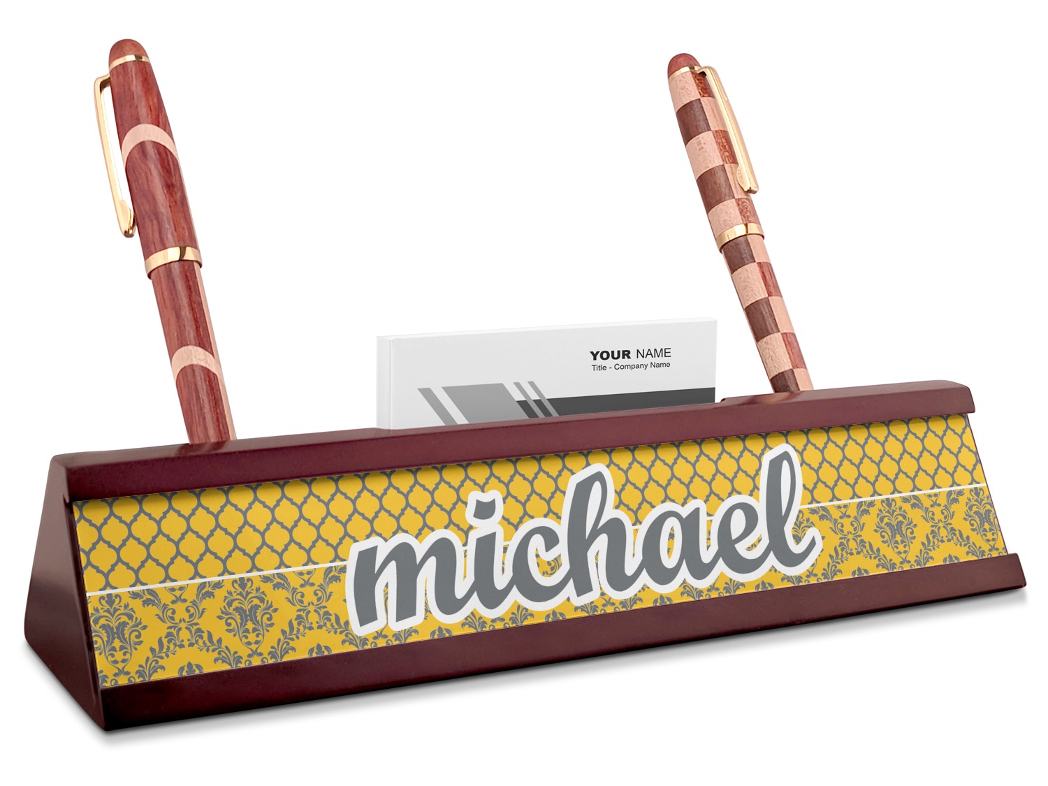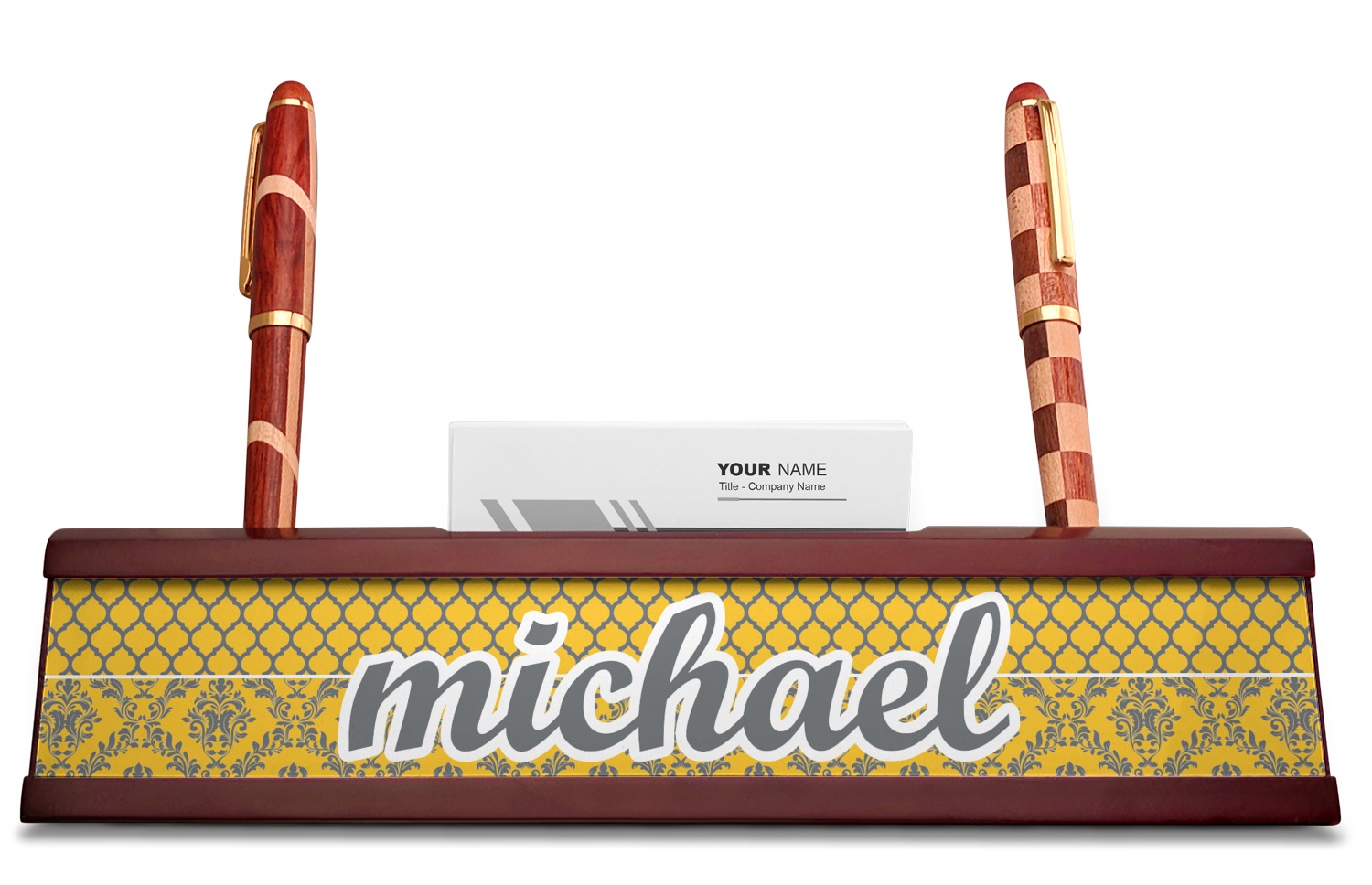 Your desk name plates are crafted from a high-quality, dark-cherry mahogany. At approximately 9.5 by 1.875 by 2.5 inches, this name plaque will fit perfectly, front and center, on your desk. Your customization spans across the entire face of the nameplate. Behind the nameplate lies a skinny slot that can fit approximately 15, traditionally-sized, business cards. You can also store your writing utensils on either side of this custom desk name plate.