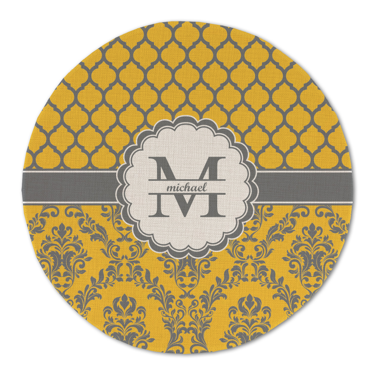 What a beautiful color combination. Introducing a gorgeous muted gold / yellow paired with a heather dove grey. The top of the design is inspired by a classic Moroccan pattern. Using yellow outlined in grey is a very unique color combination on a traditional design. The bottom half of the design stays true to tradition with a beautiful worldly damask pattern. Unique, traditional and worldly come together to form a very rich and regal look. A wide band of dove grey outlined in white bring both patterns together.