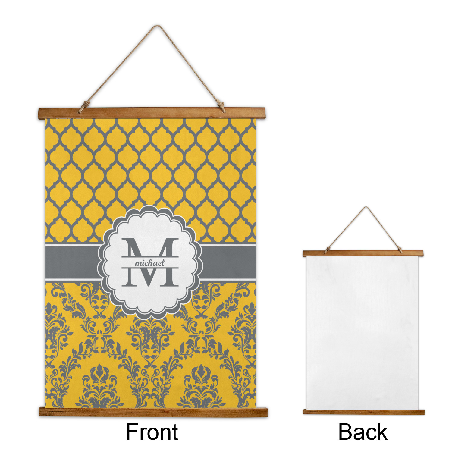 Made in two different orientations - portrait or landscape - both are 26" x 36". Your design is printed on a high quality polyester fabric with hemmed edges. The wood on the top and bottom of the tapestry is 1.25" tall and 0.25" thick and there are two pieces on top and bottom which sandwich the fabric.