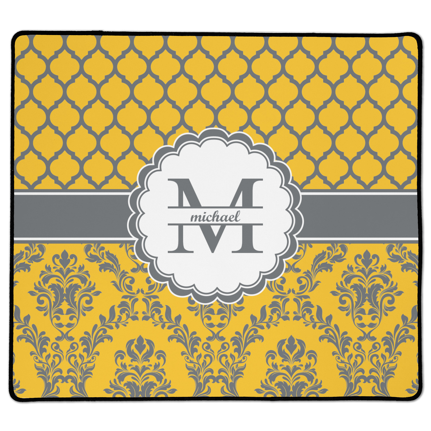 What a beautiful color combination. Introducing a gorgeous muted gold / yellow paired with a heather dove grey. The top of the design is inspired by a classic Moroccan pattern. Using yellow outlined in grey is a very unique color combination on a traditional design. The bottom half of the design stays true to tradition with a beautiful worldly damask pattern. Unique, traditional and worldly come together to form a very rich and regal look. A wide band of dove grey outlined in white bring both patterns together.
