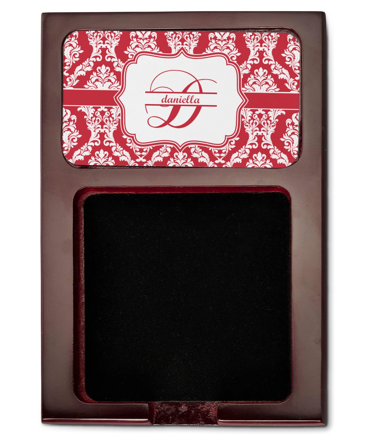 Crafted from a fine mahogany, this post it note holder is in the shade of a dark, cherry color. The dispenser itself is about 4.25 by 6.25 by 0.75 inches. You can place your 3 by 3 inch sticky notes in the indentation below the nameplate. We print your customization onto the nameplate that rests above the velvety indentation.