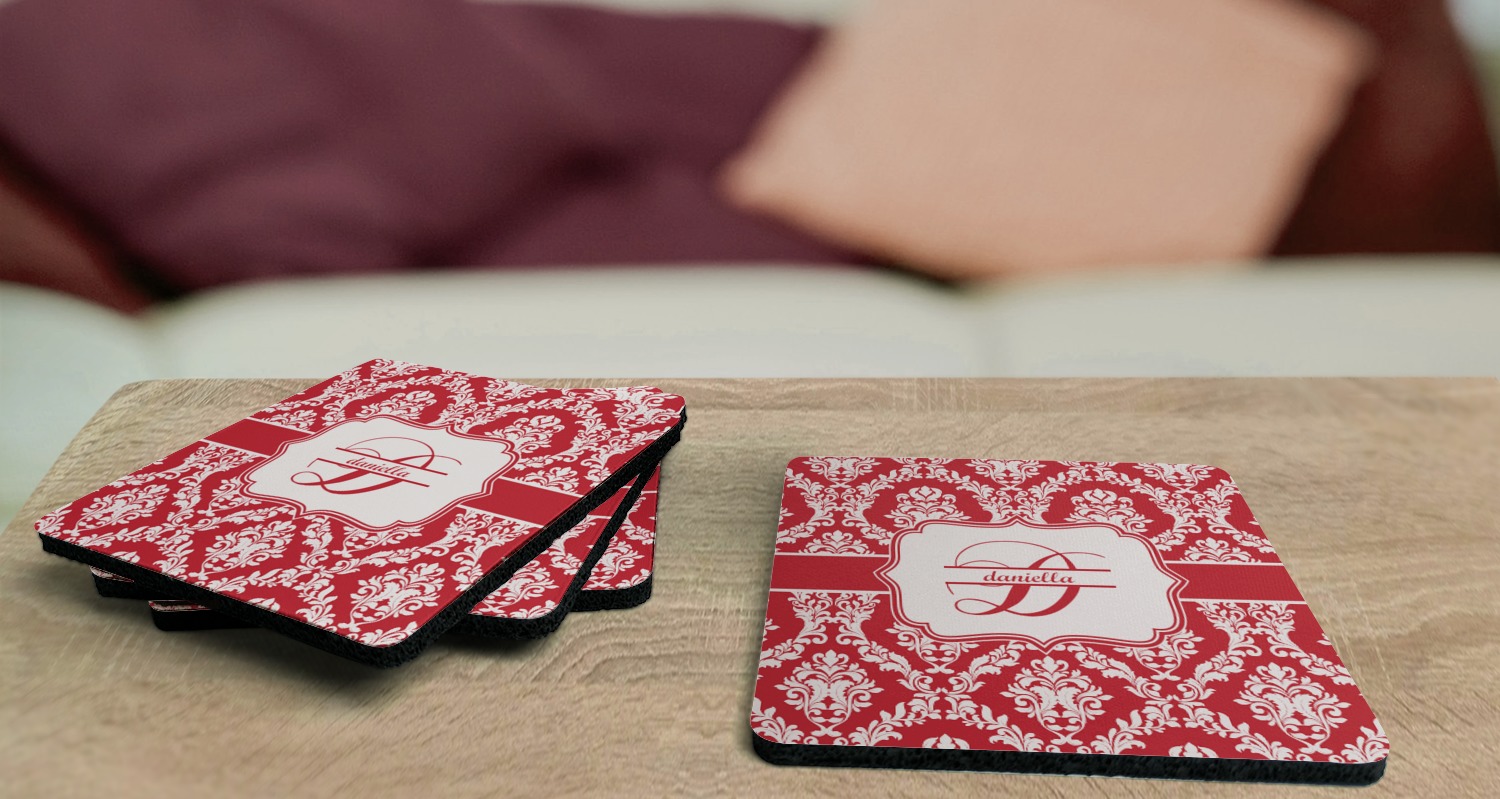 These drink coasters have a smooth, polyester top and a textured, rubber backing on its bottom. The non-slip rubber backing underneath works to keep any spills at bay. At 4 by 4 by 0.25 inches thick, these custom coasters are a suitable size for most drinkware. Your personalization is displayed atop the face of the cup coaster. We sell these rubber coasters in two different shapes: square and round. You can buy each shape as singulars or as a set of 4.