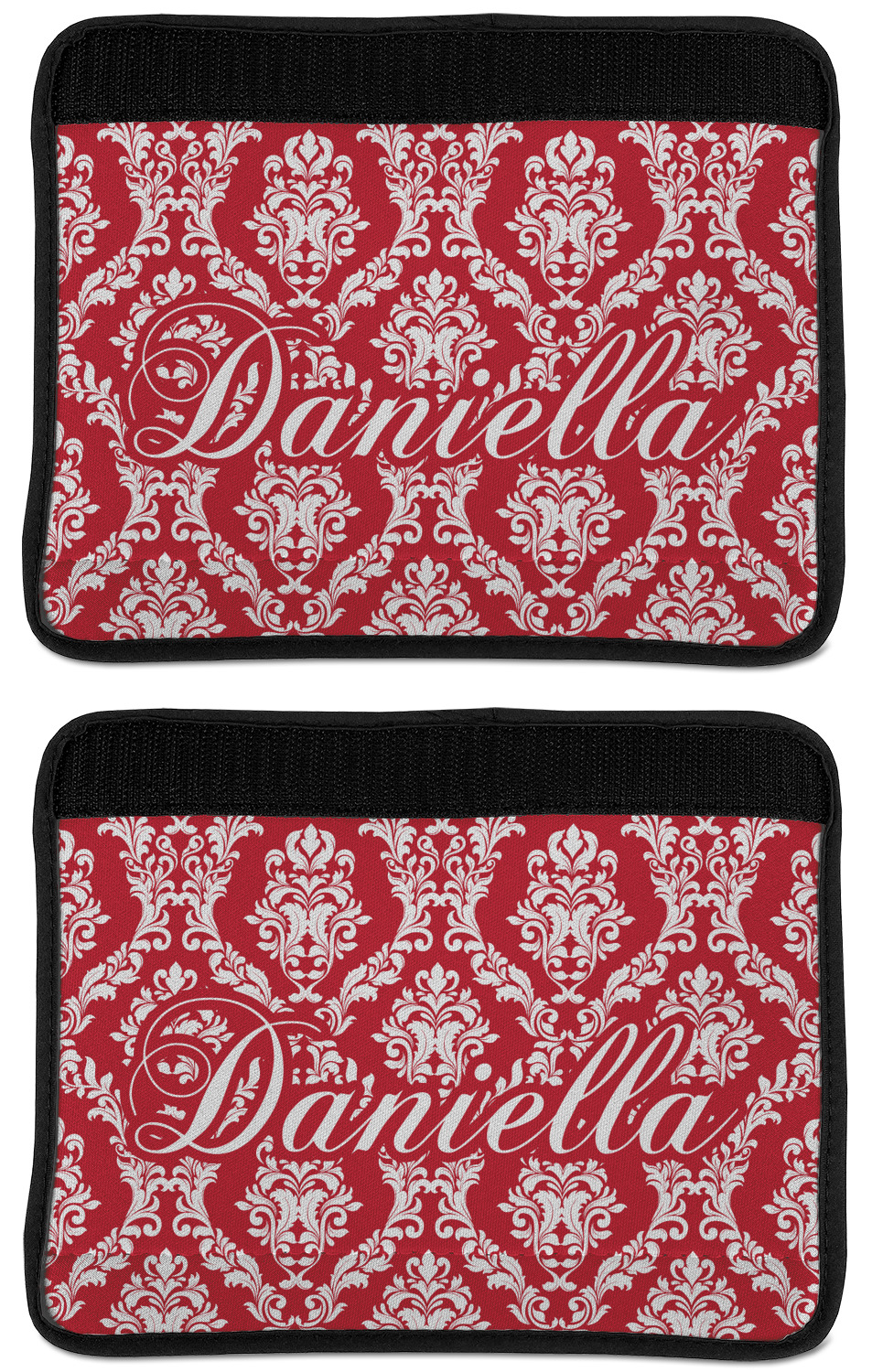 Made from neoprene, our seat belt strap covers wrap around the belt itself and have a Velcro tab for easy attachment and closure. The belt's edges are trimmed with a black polyester for a secure finish. Each cover is 9.5 by 7 inches when open and 9.5 by 2.5 inches when closed. We print your personalized design on the face of the seat belt pad.