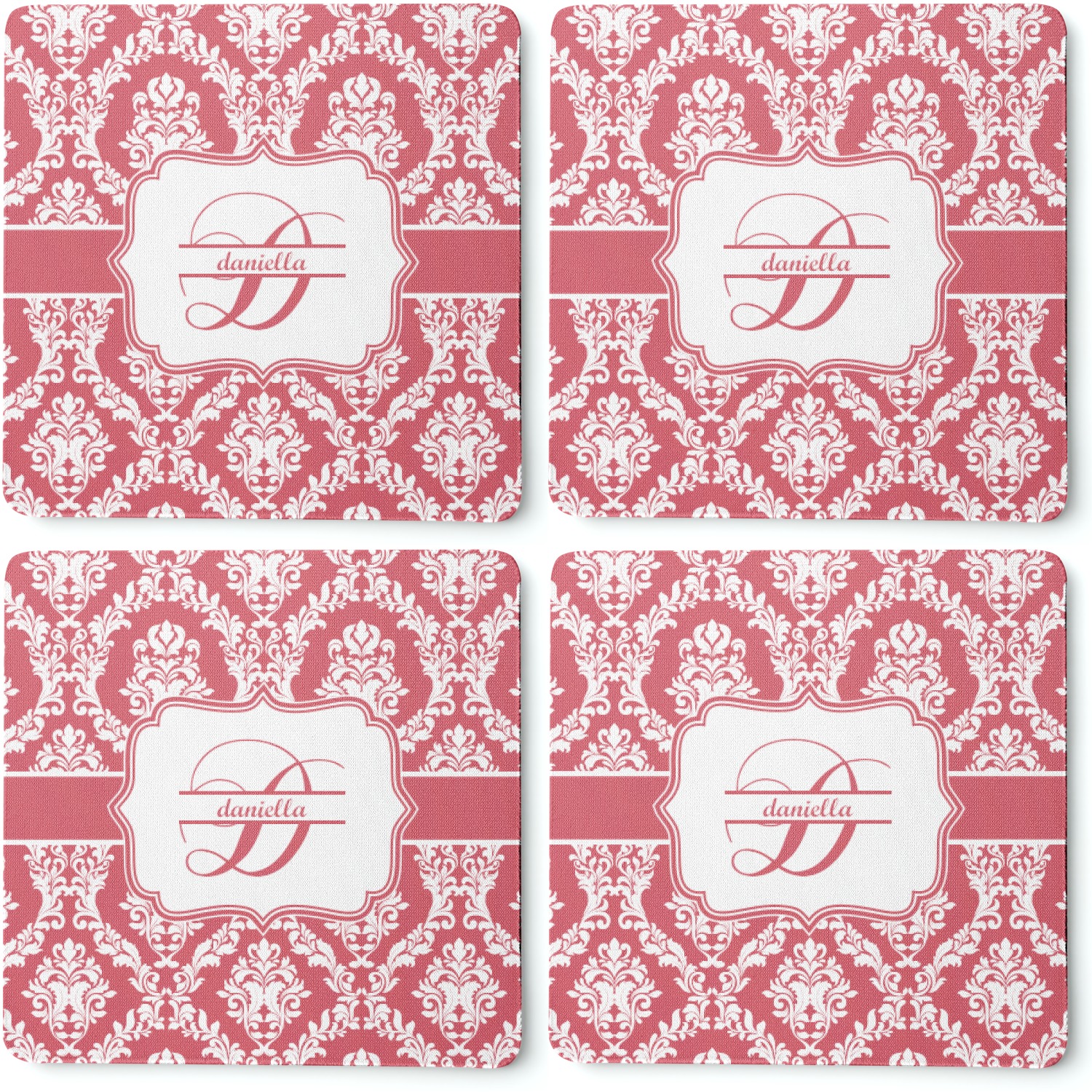 These drink coasters have a smooth, polyester top and a textured, rubber backing on its bottom. The non-slip rubber backing underneath works to keep any spills at bay. At 4 by 4 by 0.25 inches thick, these custom coasters are a suitable size for most drinkware. Your personalization is displayed atop the face of the cup coaster. We sell these rubber coasters in two different shapes: square and round. You can buy each shape as singulars or as a set of 4.