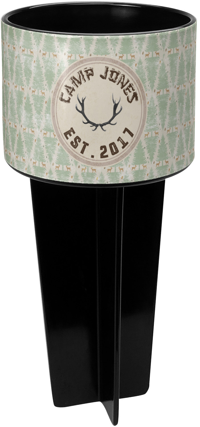 This cup holder has a large stake at its bottom that anchors it to the sand or ground below, while the cup holder rests above the stake. The entire drink holder is made of durable plastic and displays your customization around the cup holder portion. We sell these personalized beach spikers in two different colors: black and white.